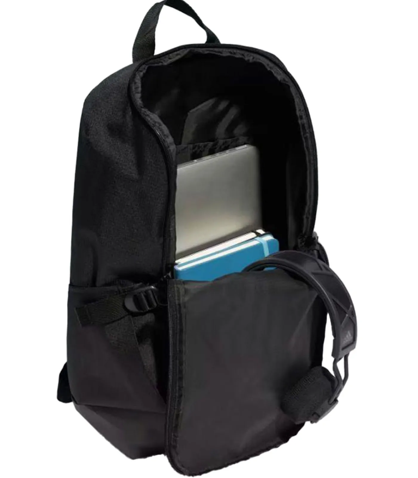 Adidas Essentieel – Zwart Rugzak gemaakt van 100% gerecycled polyester met een glad weefsel. De hoogte is 46 cm, breedte 30 cm en het volume is 23,2 L. De diepte is 16 cm. Deze zak bevat één voorzak, rits en twee zijzakken. Het hoofdcompartiment, achtercompartiment en laptop zijn onderverdeeld. De rug van dit zakje is waterbestendig door middel van gaas. De borst en schouder riem zijn verstelbaar, evenals het handvat dat gecoate onderkant heeft. Het ontwerp bevat het Adidas logo en streepjesdetails. Het zaktje wordt vastgehouden door een tweewegrits.