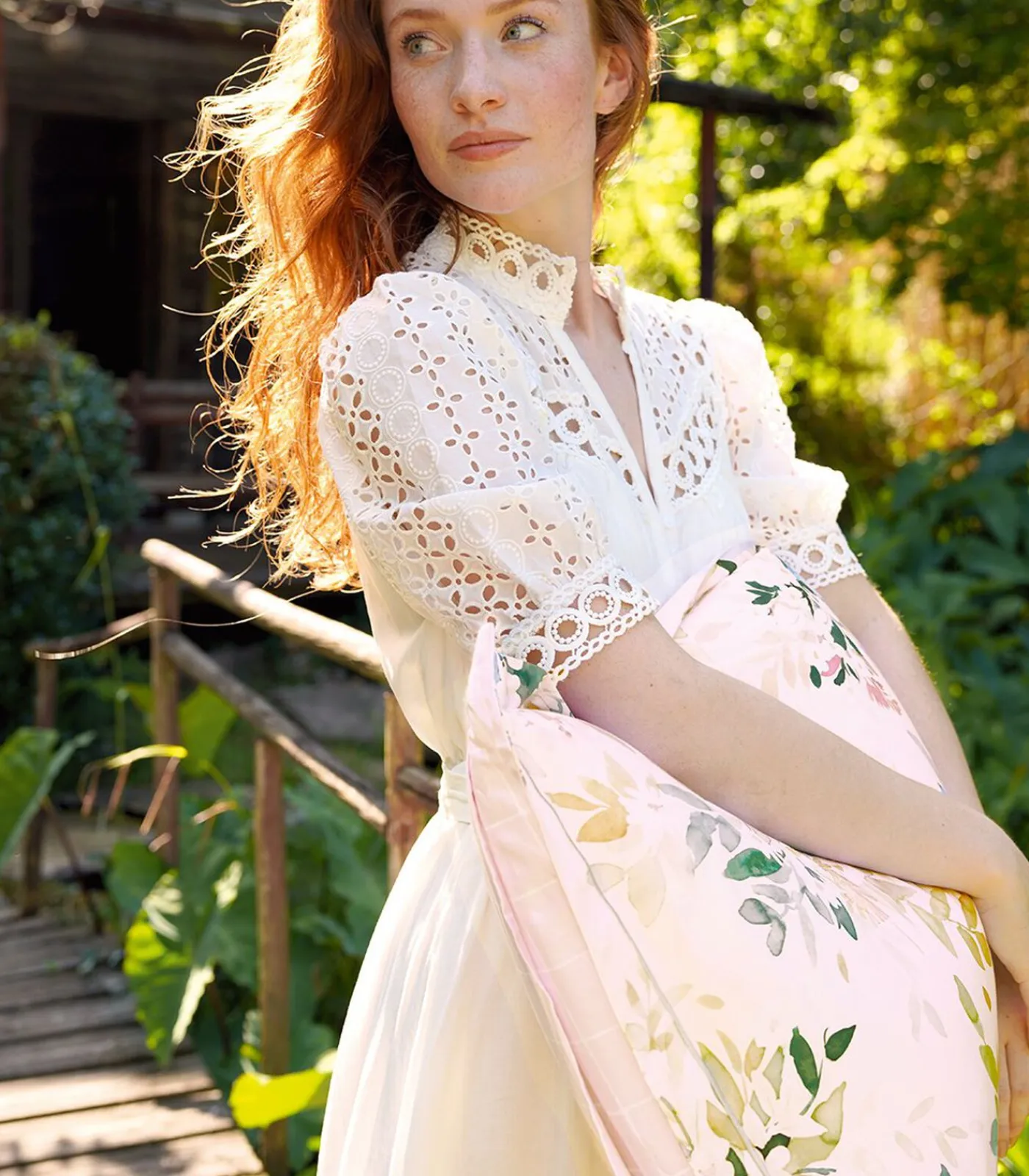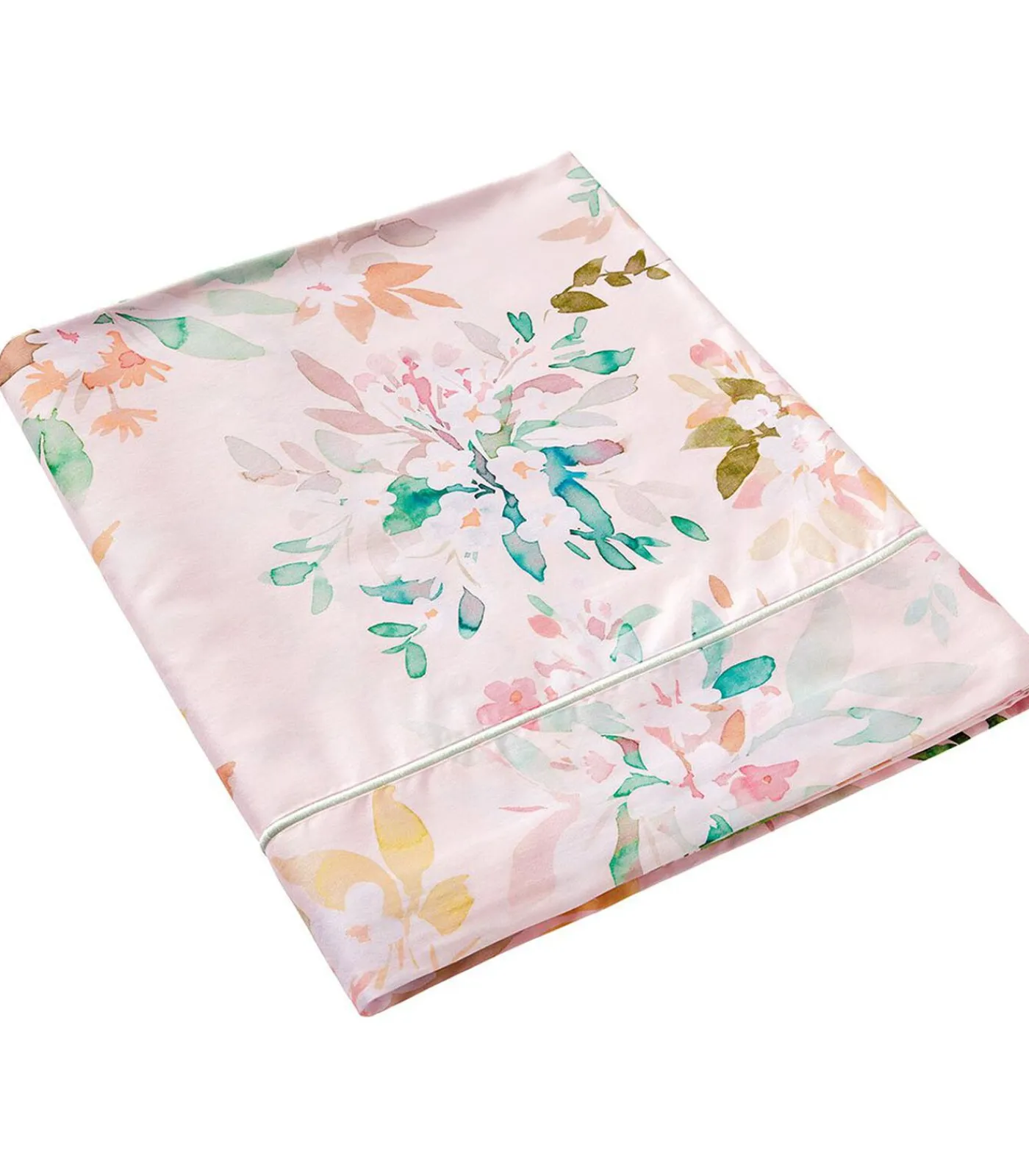 Bedrukking van aquarelbloemen op een lichtroze achtergrond.Bies van 8 cmAfgewerkt met een fijne lichtgroene bourdonsteek.