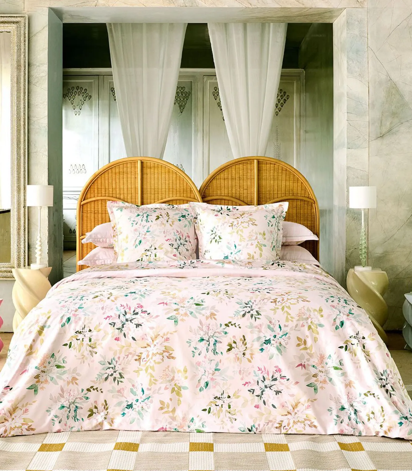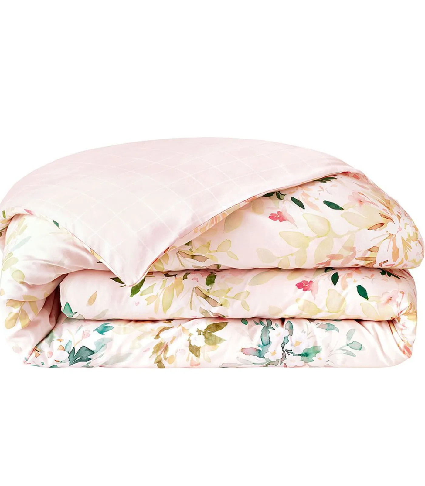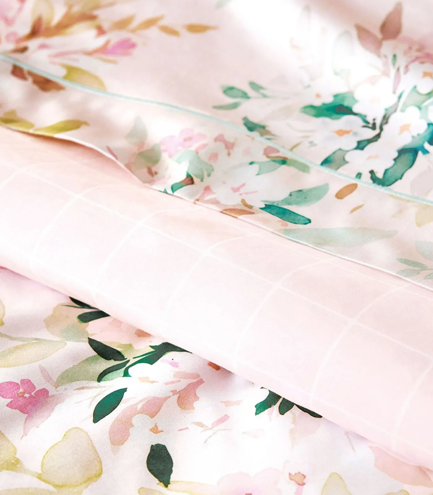 Bedrukking van aquarelbloemen op een lichtroze achtergrond.Keerzijde bedrukt met ruitjesmotief op een lichtroze achtergrond.Afgewerkt met een flessluiting.