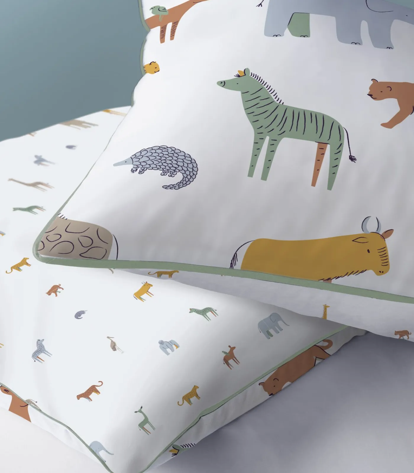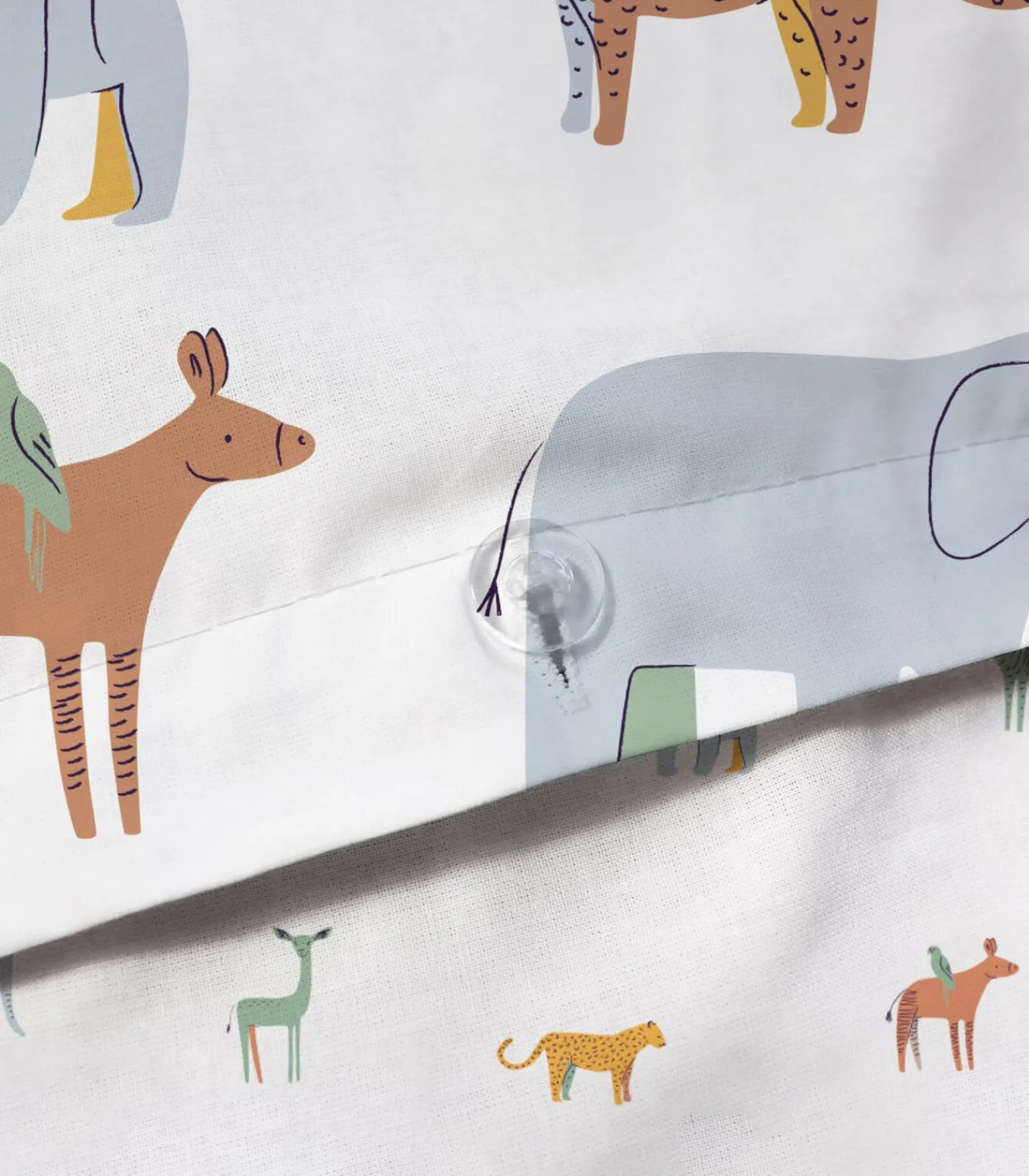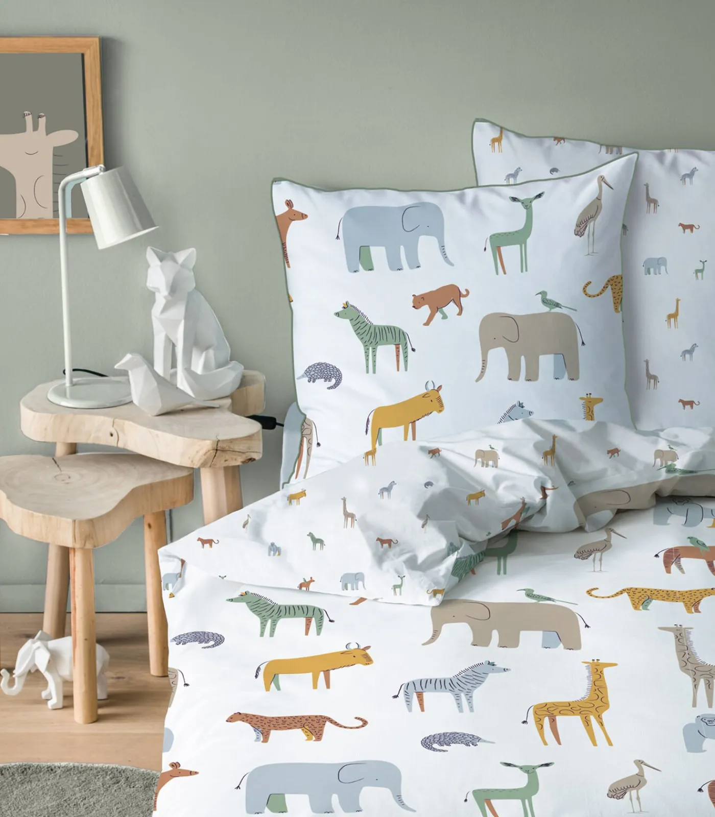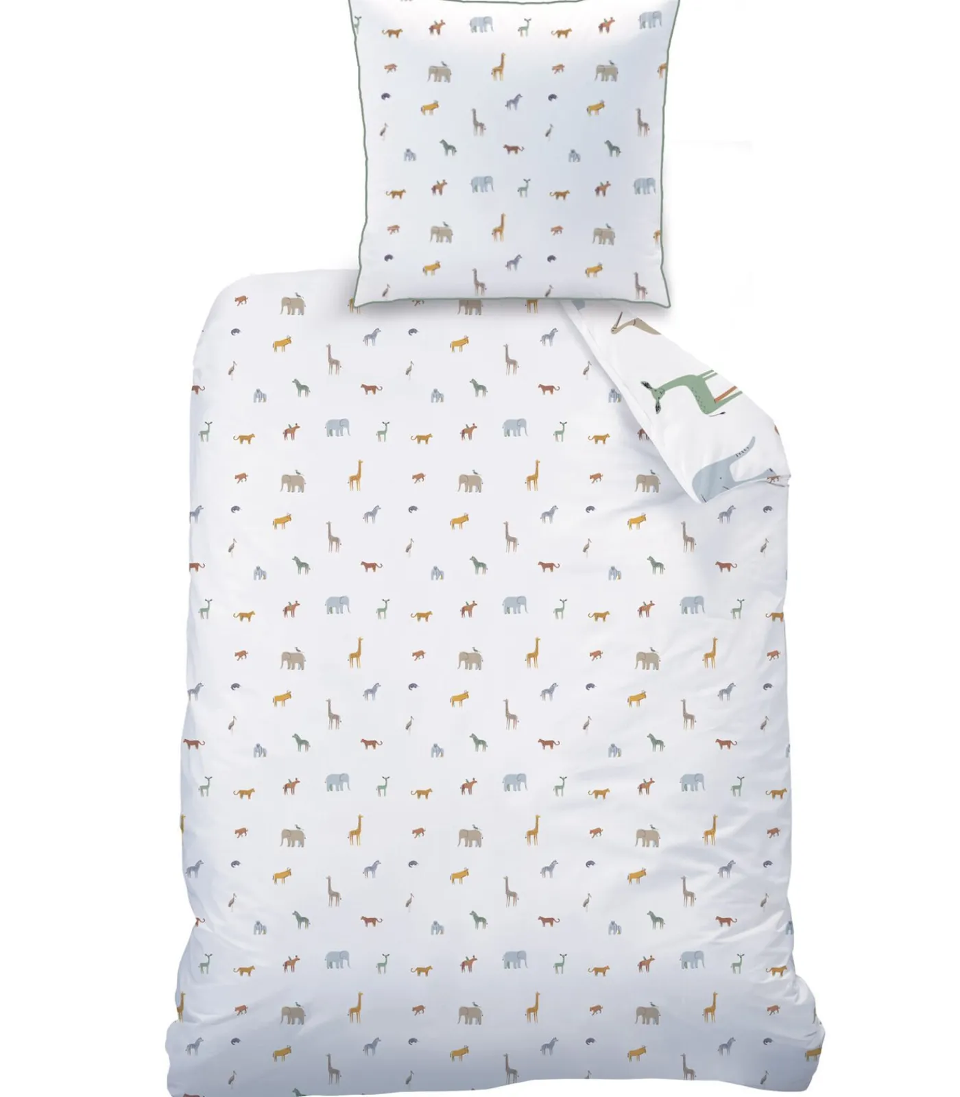 Bedrukt beddengoed 100% katoen, KENYA MATT & ROSEDe KENYA set van MATT & ROSE bestaat uit een dekbedovertrek van 140×200 cm en een kussensloop van 63×63 cm. 100% kwaliteitskatoen (57fils/cm²). Deze set is prachtig bedrukt met dieren uit de Afrikaanse savanne. Bovendien is het omkeerbaar. Omkeerbaar, met een voorkant met grote dieren op een witte achtergrond en een achterkant met dezelfde kleinere dieren. Afgewerkt met groene biezen rond de kussensloop.Kenmerken van de KENYA set:Materiaal: 100% katoen 57 draden/cm².Omkeerbaar! 2 bedrukte zijden om naar wens van stijl te veranderenKnoopsluitingWasbaar op 40°.Wie is MATT & ROSE? MATT & ROSE is een jong Frans huishoudlinnenmerk met erkende expertise. Onze producten voldoen aan drie eisen: een unieke stijl, hoogwaardige materialen en betaalbare prijzen. Dit product is gecertificeerd OEKO–TEX® standaard 100 CQ901–1 IFTH, wat de controle garandeert van resthoeveelheden schadelijke stoffen in zeer lage verhoudingen, zonder gevaar voor de mens. Onze producten worden regelmatig getest door erkende laboratoria om aan deze certificering te voldoen. We zijn ook lid van de BSCI, die goede arbeidsomstandigheden garandeert.
