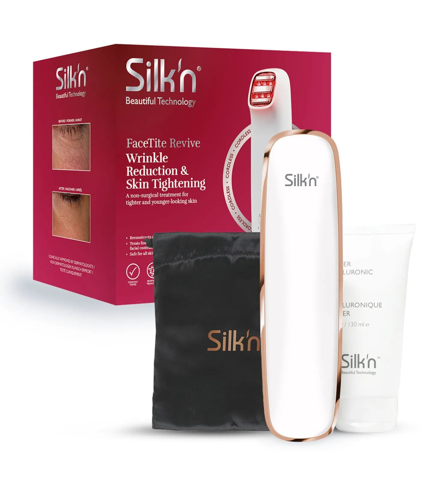 Silk’n FaceTite Revive is een anti–ageing apparaat dat op natuurlijke wijze zorgt voor het verminderen van rimpels en kraaienpootjes, het herstellen van collageen– en elastinevezels en het liften van de gezichtscontouren. Zo zorgt het apparaat met zijn drie technologiën voor een strakker en jonger uitziende, stralende huid. De FaceTite Revive wordt geleverd inclusief opbergzakje.