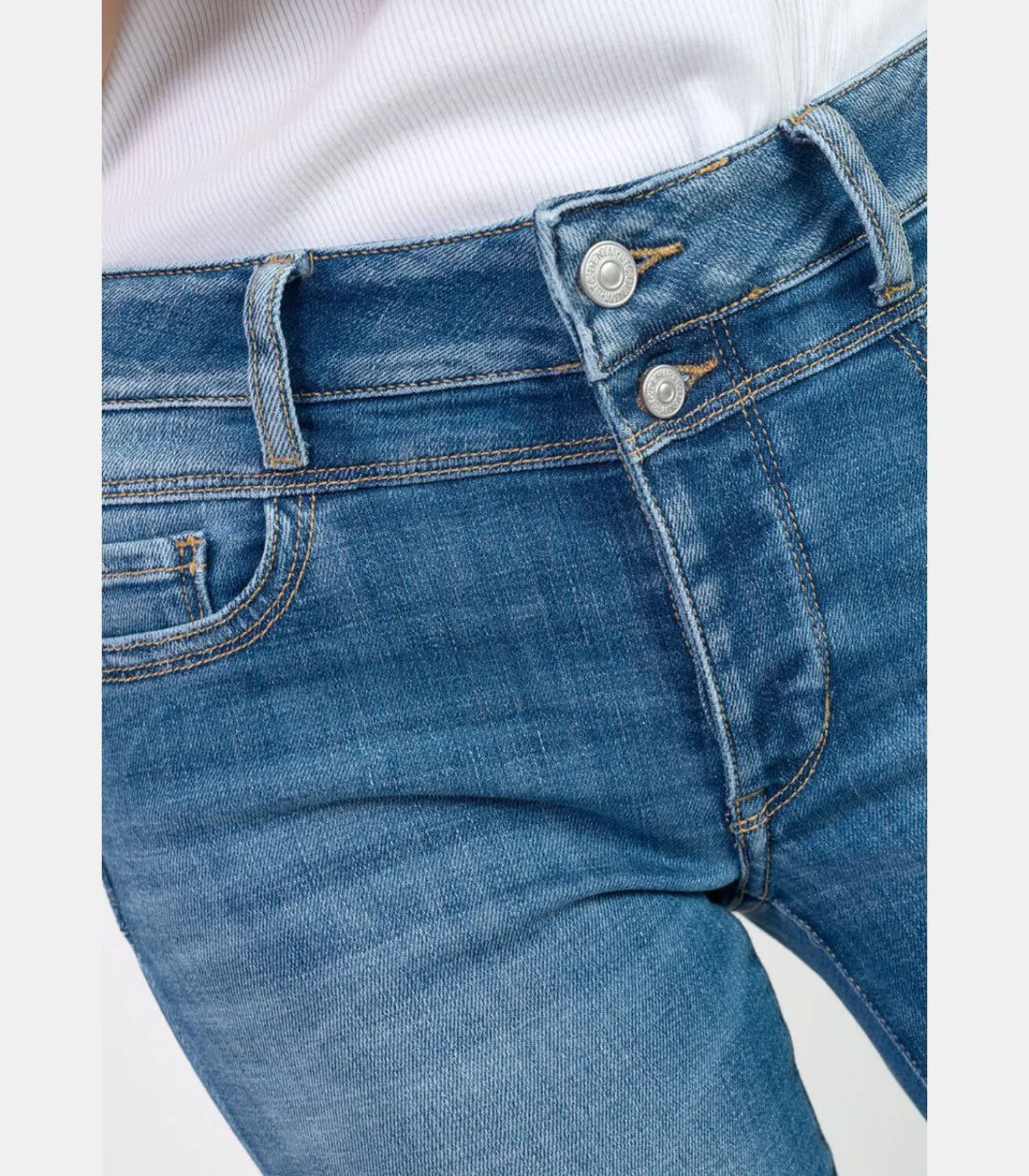 Nauw aansluitende pasvorm, regular voor de pijpen. Een mooi gevormd lichaam en een gegarandeerd mooi achterwerk door het push–up effect in combinatie met de hoge taille. Een jeans die iedere lichaamsbouw mooi doet uitkomen: slank, rond, klein of groot!