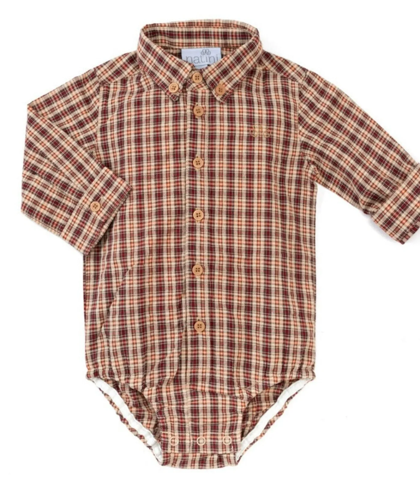 Bordeaux met beige geruit bodyhemdje. Een bodyhemdje doe je het gemakkelijkst aan van onder naar boven, dus eerst de benen en nadien de armen. Combineer het hemdje met een beige of oranje v–pull.