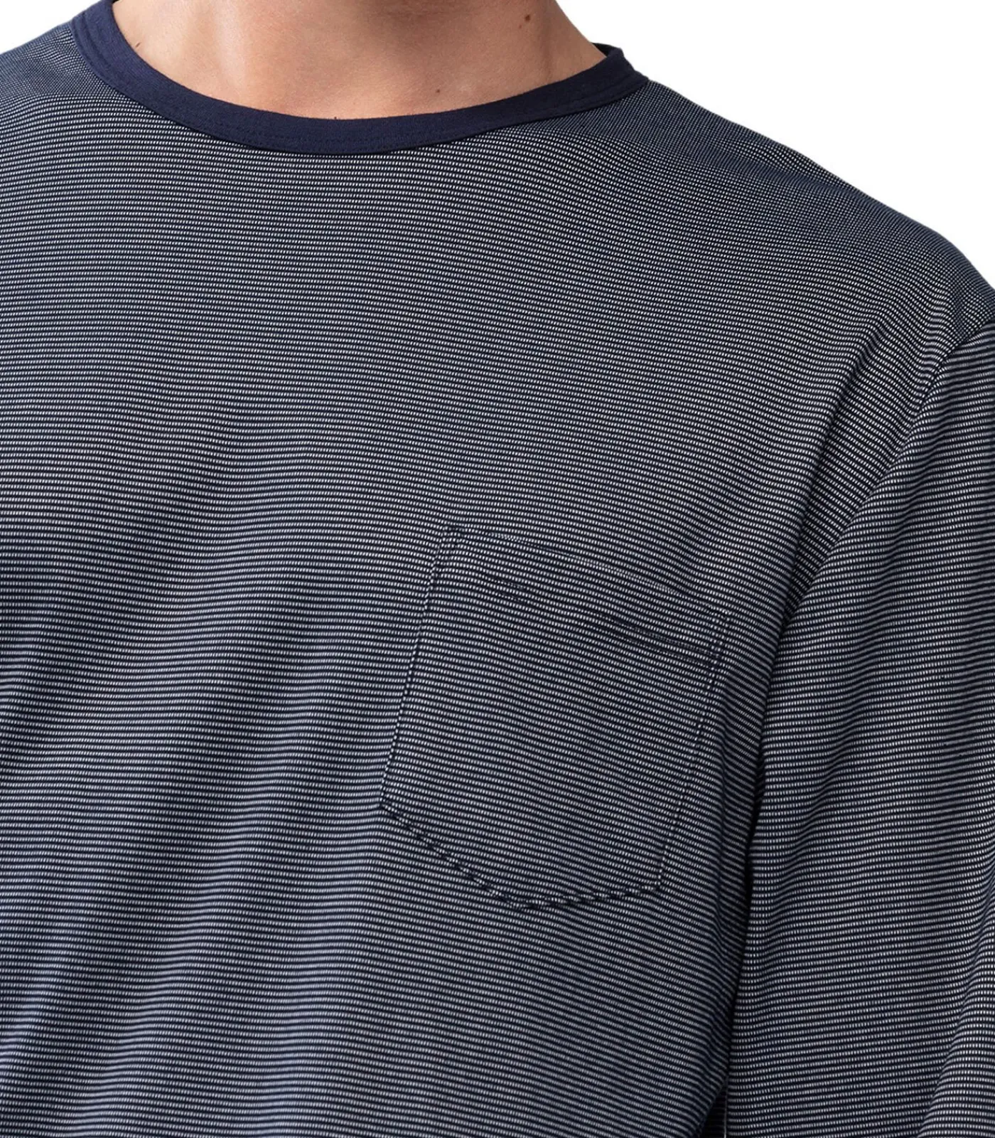 Lange pyjamaset uit de Bennison serie met gestreepte top en effen broek. De casual pasvorm zorgt voor een losse fit en ontspannen nachten. Shirt met praktische borstzak en ronde hals. Broek met elastische comfort tailleband. Gemaakt van zachte jersey.