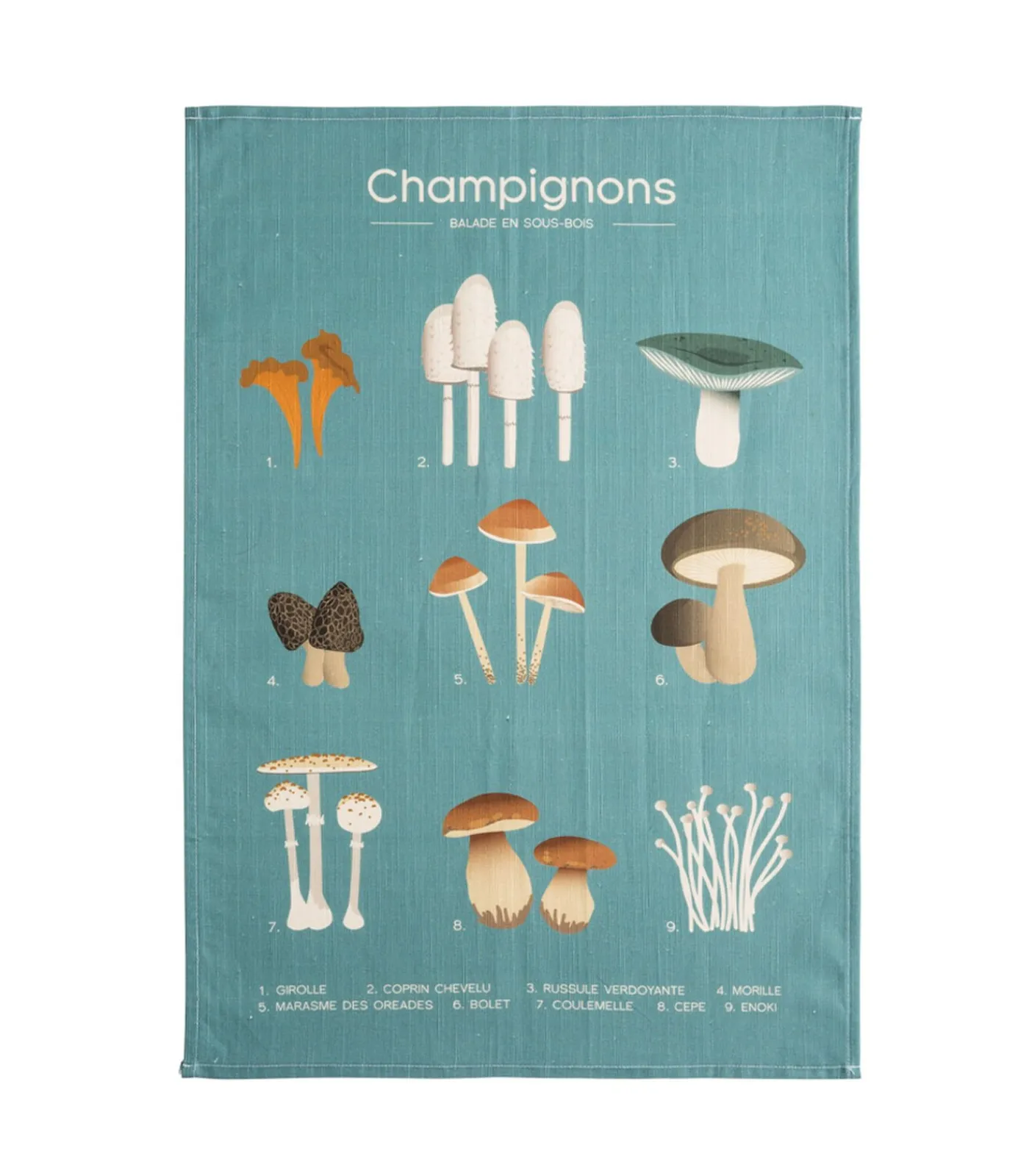 Ontworpen in de stijl van een educatief bord en versierd met een groot aantal paddenstoelen, is het model Balade en sous–bois een heerlijke herinnering aan boswandelingen en paddenstoelen plukken. Hij heeft een zeer trendy blauwe achtergrond als interieurdecoratie en een geweven stof. Afdrogen wordt zo een fluitje van een cent.