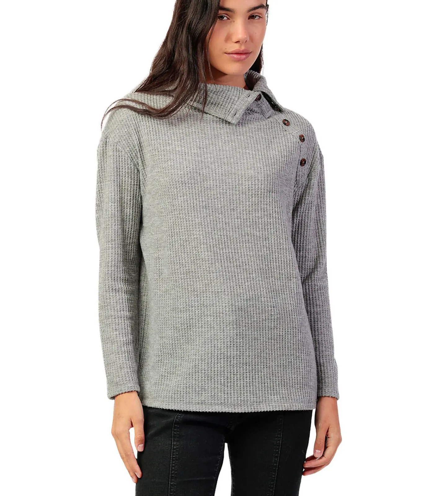 Deze trui heeft een casual maar chique stijl, ideaal voor de koelere seizoenen. Dik geribd breisel dat zacht en warm aanvoelt, asymmetrische opstaande kraag met overslag voor een originele touch. Drie decoratieve knopen op de linkerschouder voegen een stijlelement toe en versterken de asymmetrische kraag. Lange mouwen, recht model en lichtjes los, voor optimaal comfort. Ideaal voor casual chic, perfect voor een cocooning outfit of voor een eenvoudige, elegante herfst–winterlook.[Top apart verkrijgbaar. Kousen, sieraden en andere accessoires die het model op de foto’s draagt, zijn niet inbegrepen].