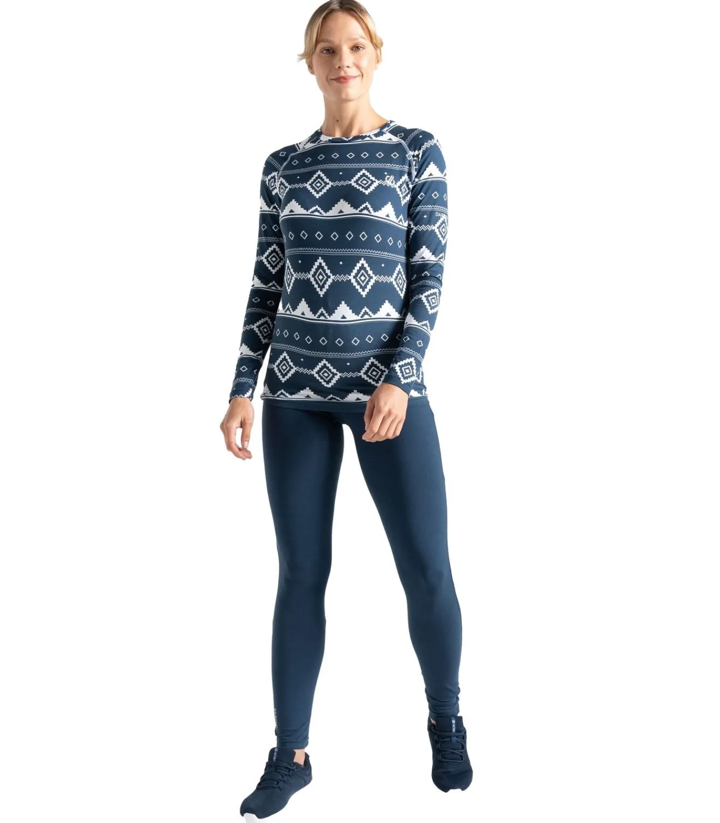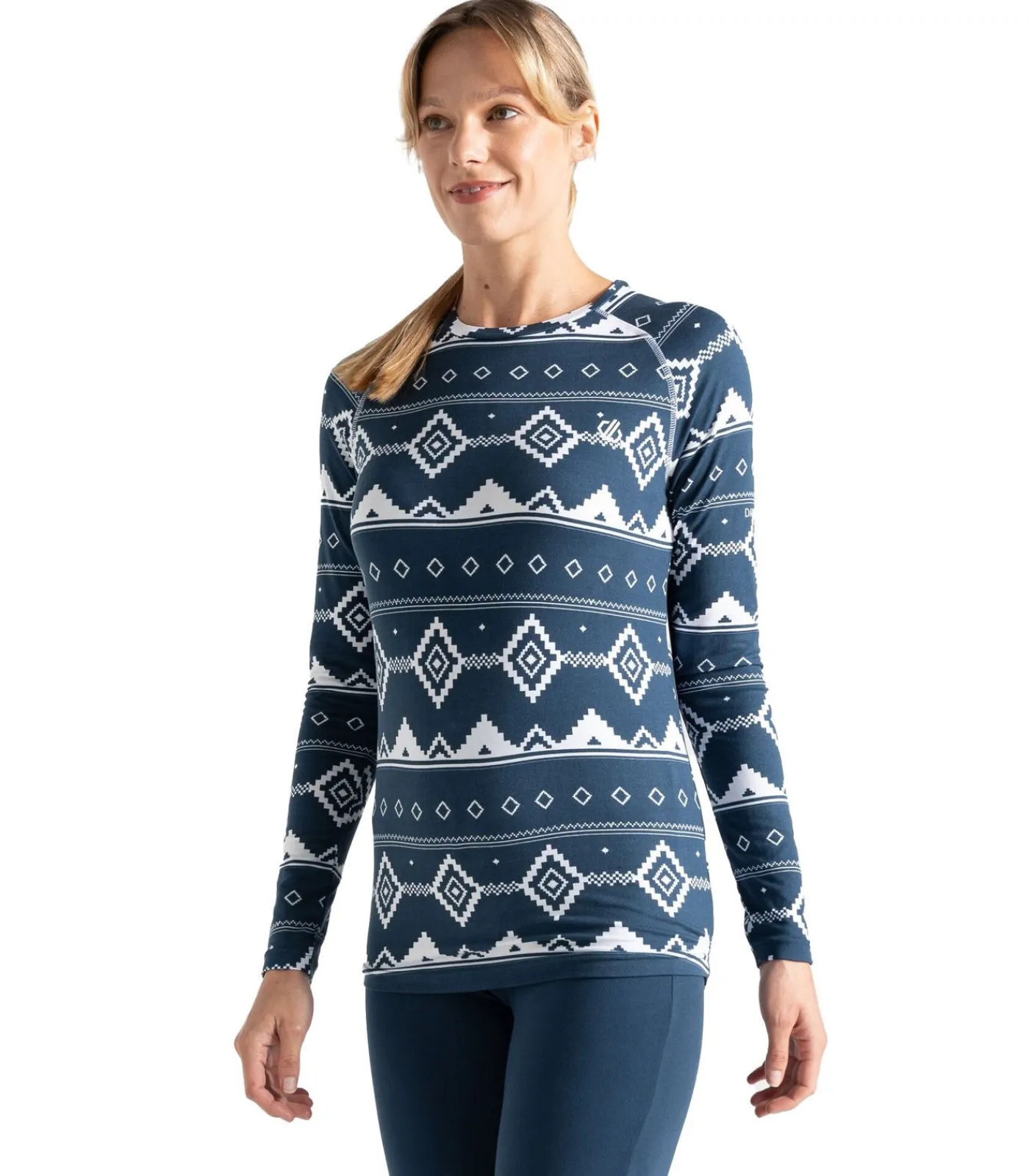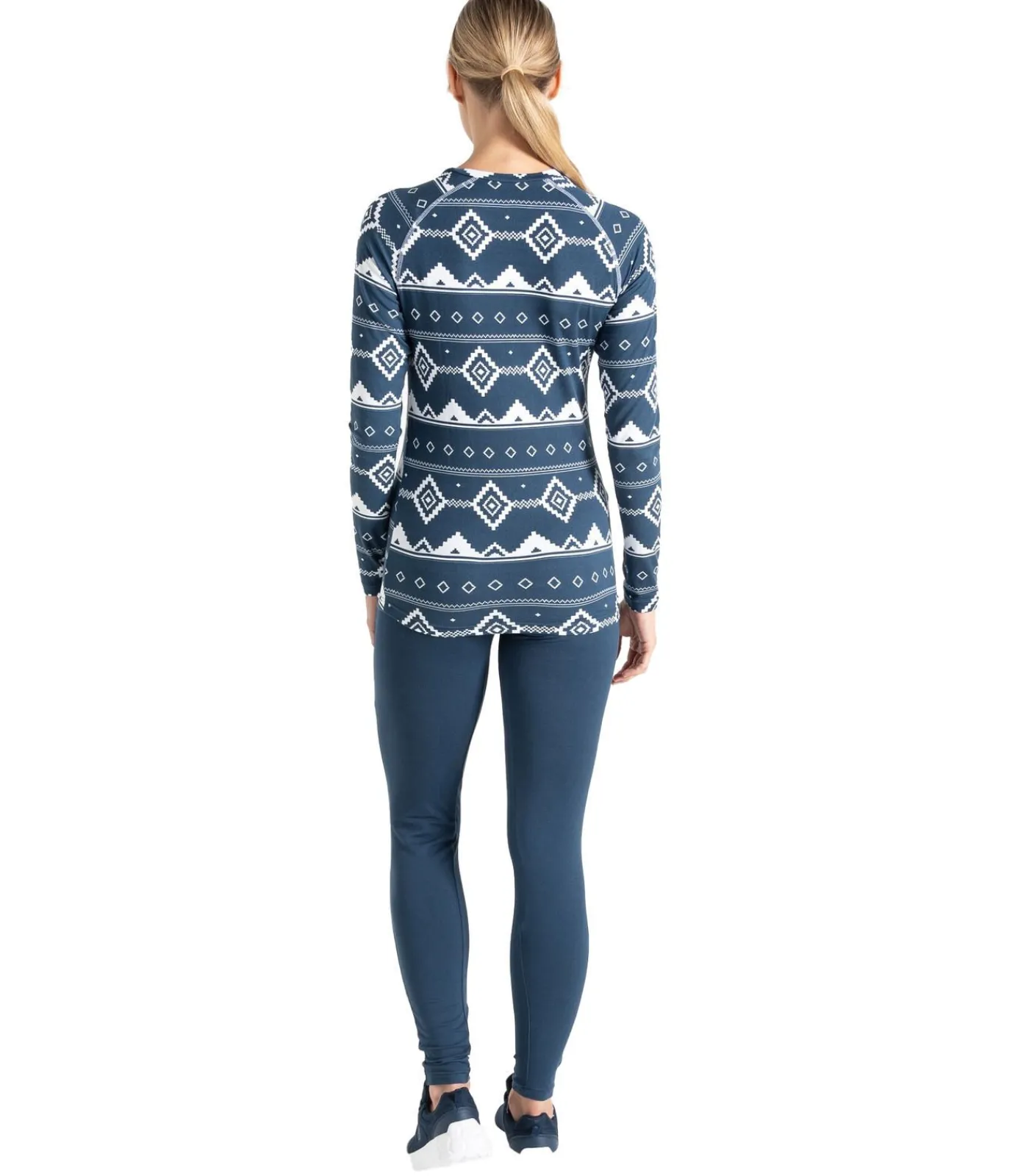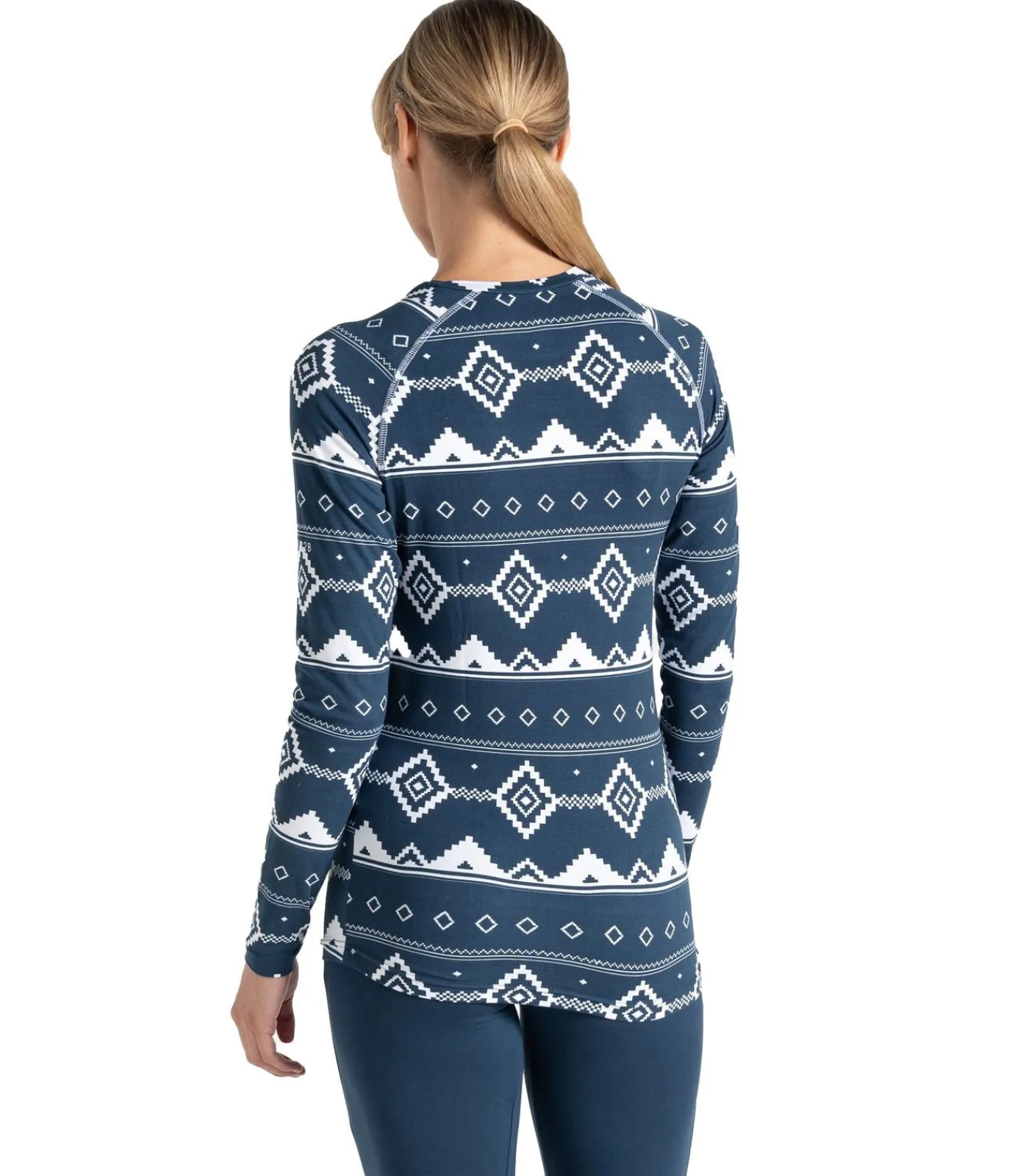 Deze productomschrijving betreft een damesbasislagenset van Dare 2B bestaande uit een boven– en onderstuk van een 93% gerecycled polyester en 7% elastaanmix. De stof voelt zacht en geborsteld aan en heeft een fair isle–dessin met gestippelde patronen. De top met ronde hals heeft raglanmouwen voor meer bewegingsvrijheid. Beide stukken zijn ontworpen om aan te trekken en hebben elastische taillebanden aan de onderkant. Het materiaal is bedoeld om thermisch, sneldrogend, vochtafvoerend en antibacterieel te zijn door het gebruik van Dare 2B’s Q–Wic Plus–stoftechnologie.