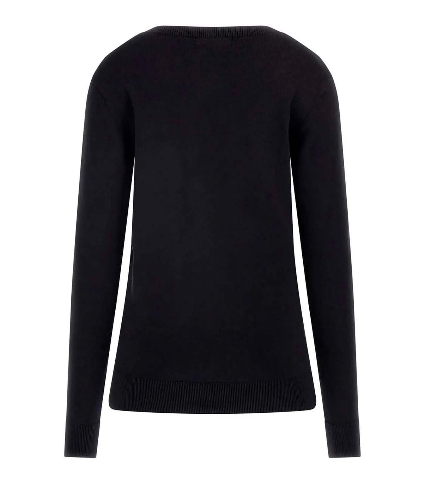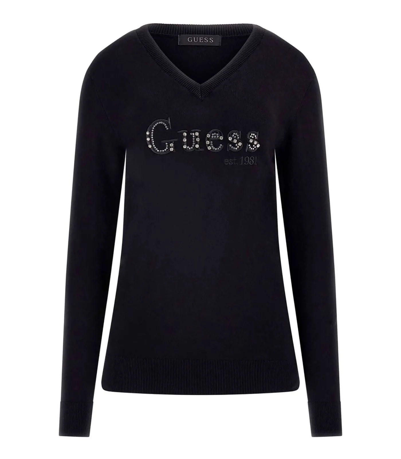 Kleur: Jet Black. Samenstelling: 82% viscose, 16% polyamide, 2% elastaan. Mouwen: lang. Halslijn: V–hals. Details: Logo op de voorkant versierd met felle Guess strass–steentjes (opgericht in 1981). Gebruik: Perfect om dagelijkse outfits een elegante en vrouwelijke touch te geven, ideaal te combineren met jeans of rokken voor een verfijnde en glamoureuze look.