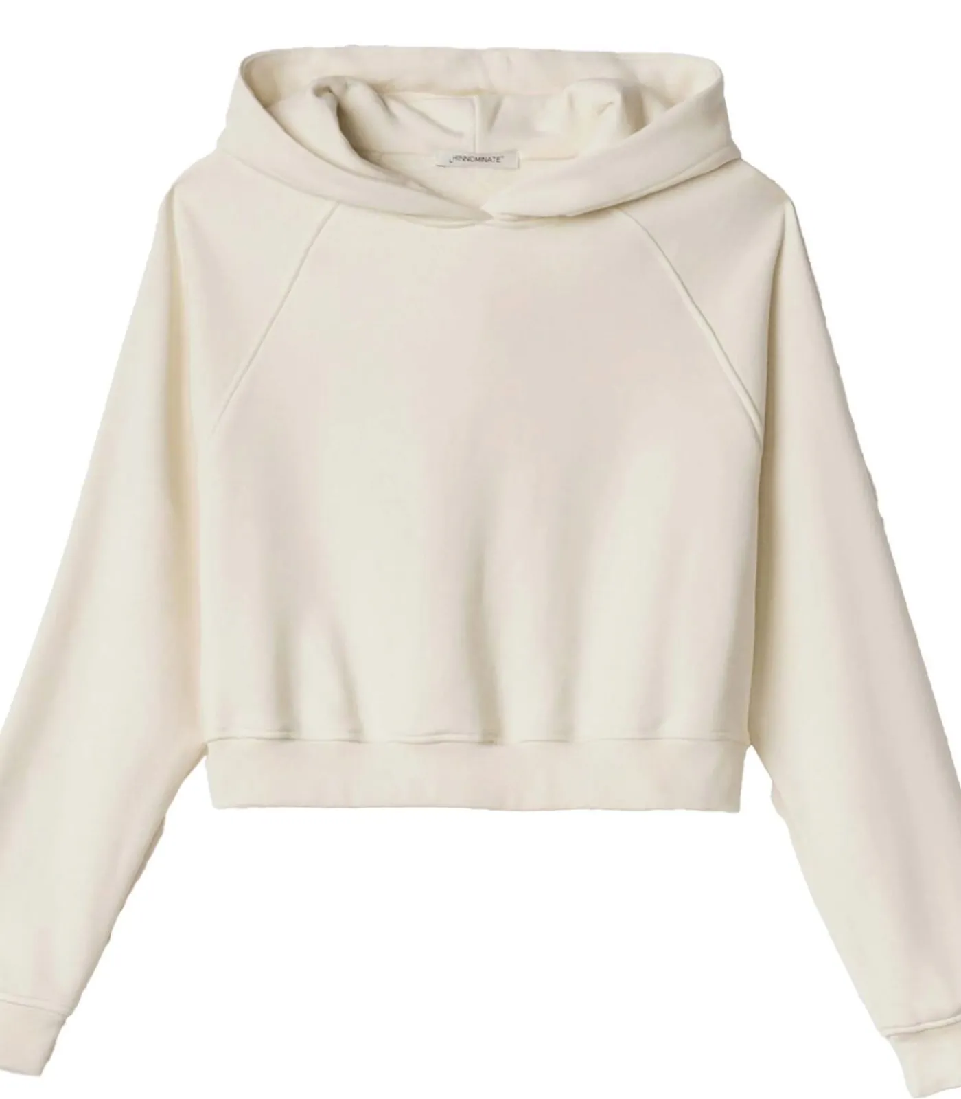 Kleur: Boterwit Samenstelling: 90% katoen, 10% polyester Mouwen: Lange raglan Halslijn: Capuchon Pasvorm: Boxy Details: Hoodie met raglanmouwen, een cropped model en logo op de manchetten. Gemaakt van zachte en comfortabele stof. Gebruik: Ideaal voor vrije tijd en ontspanning, perfect te combineren met een bijpassende broek voor een eigentijdse, casual look.