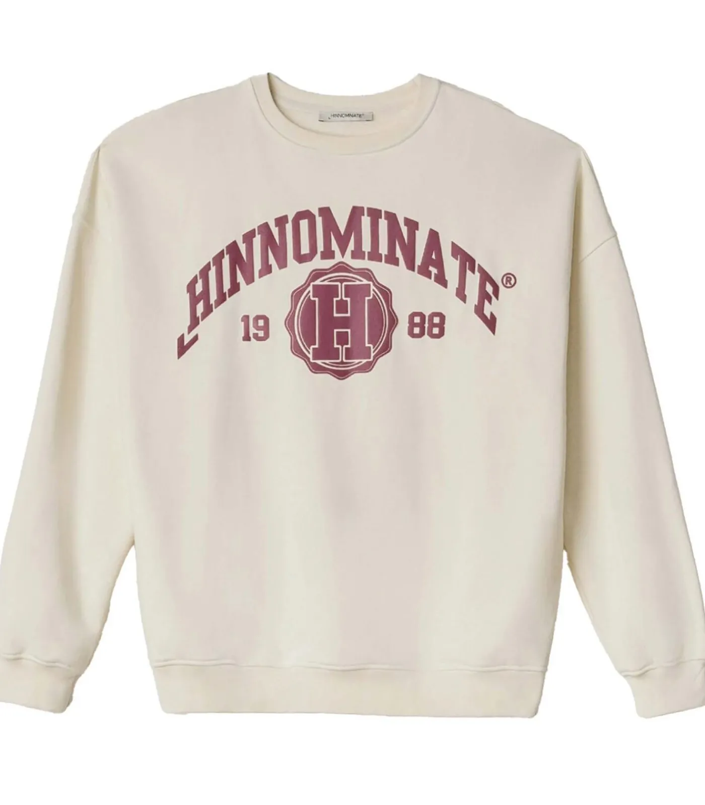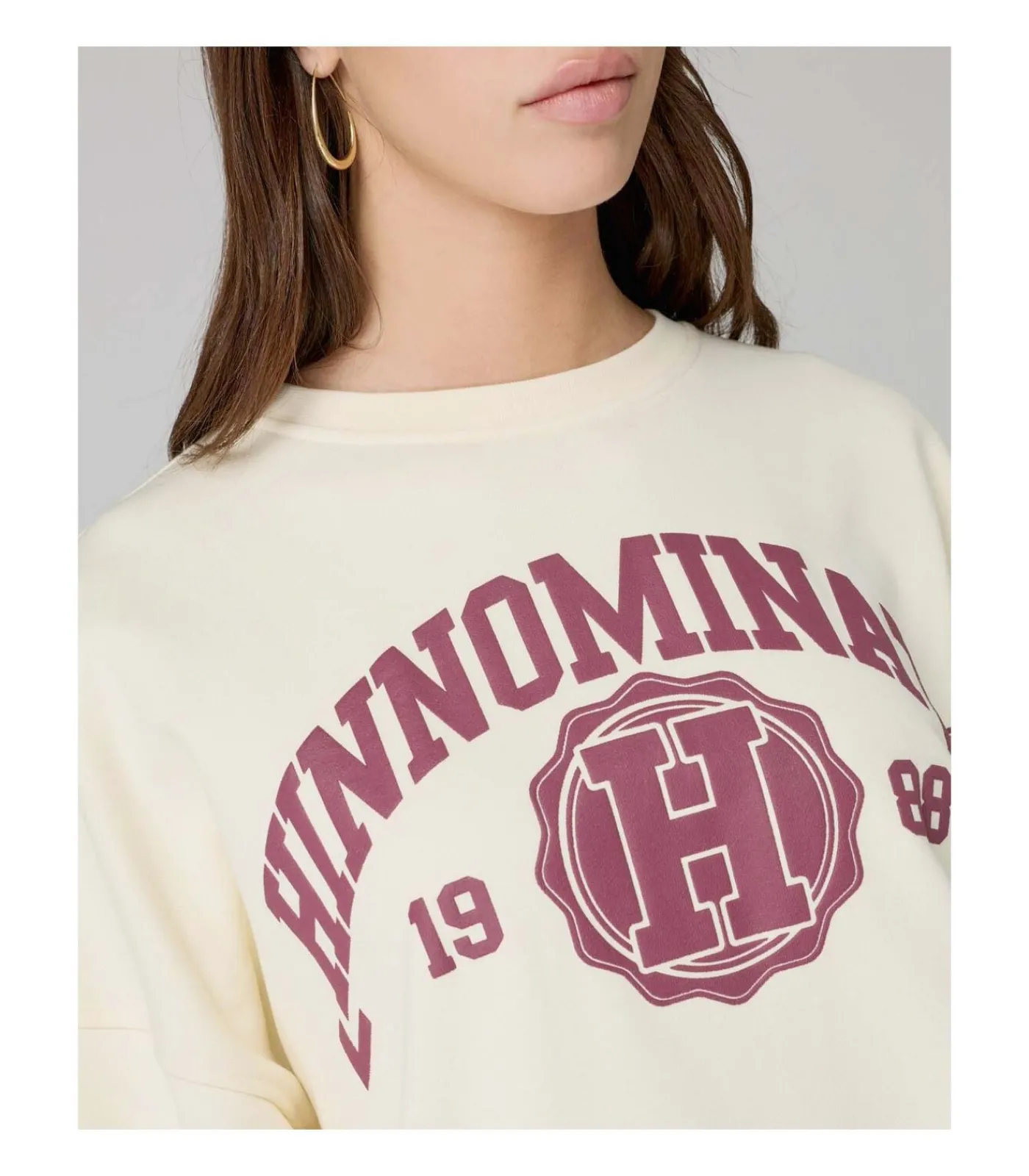 Kleur: Boterwit. Samenstelling: 90% katoen, 10% polyester. Mouwen: Lang. Halslijn: Ronde hals. Pasvorm: Oversized. Details: Sweatshirt in collegestijl met ronde hals, contrasterende print op de voorkant en Hinnominate–logo. Geribbelde zomen voor extra comfort. Gebruik: Ideaal voor een casual look met een sportieve touch, perfect om in je vrije tijd te dragen met een pantalon of denim.