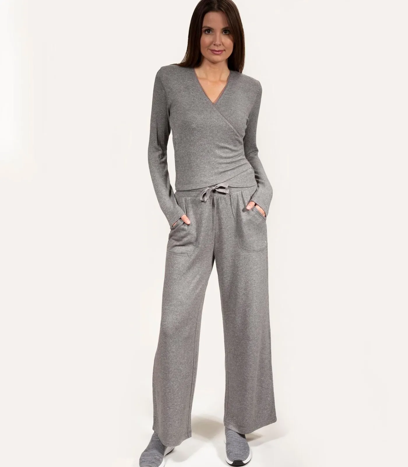 De nieuwe ultrazachte homewear–lijn van Isotoner is grotendeels gemaakt van ECOVERO™ viscose. Deze gevlekte grijze broek met wijde pijpen die ongelooflijk zacht aanvoelt, combineert veel comfort met elegantie dankzij de zakken, elastische hoge taille en verstelbare satijnen koord in de taille.Het model is 177 cm lang en draagt maat 34/36.