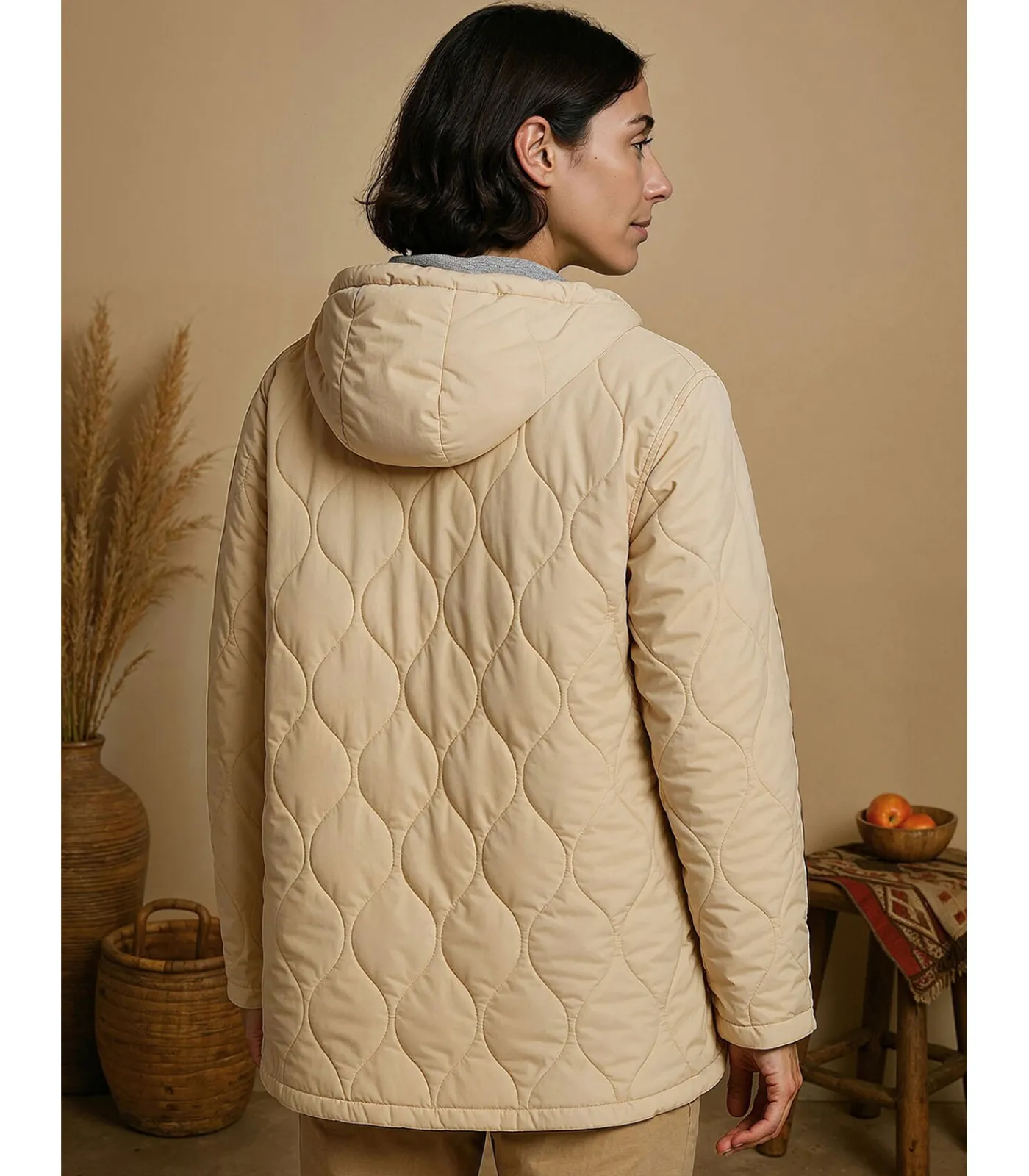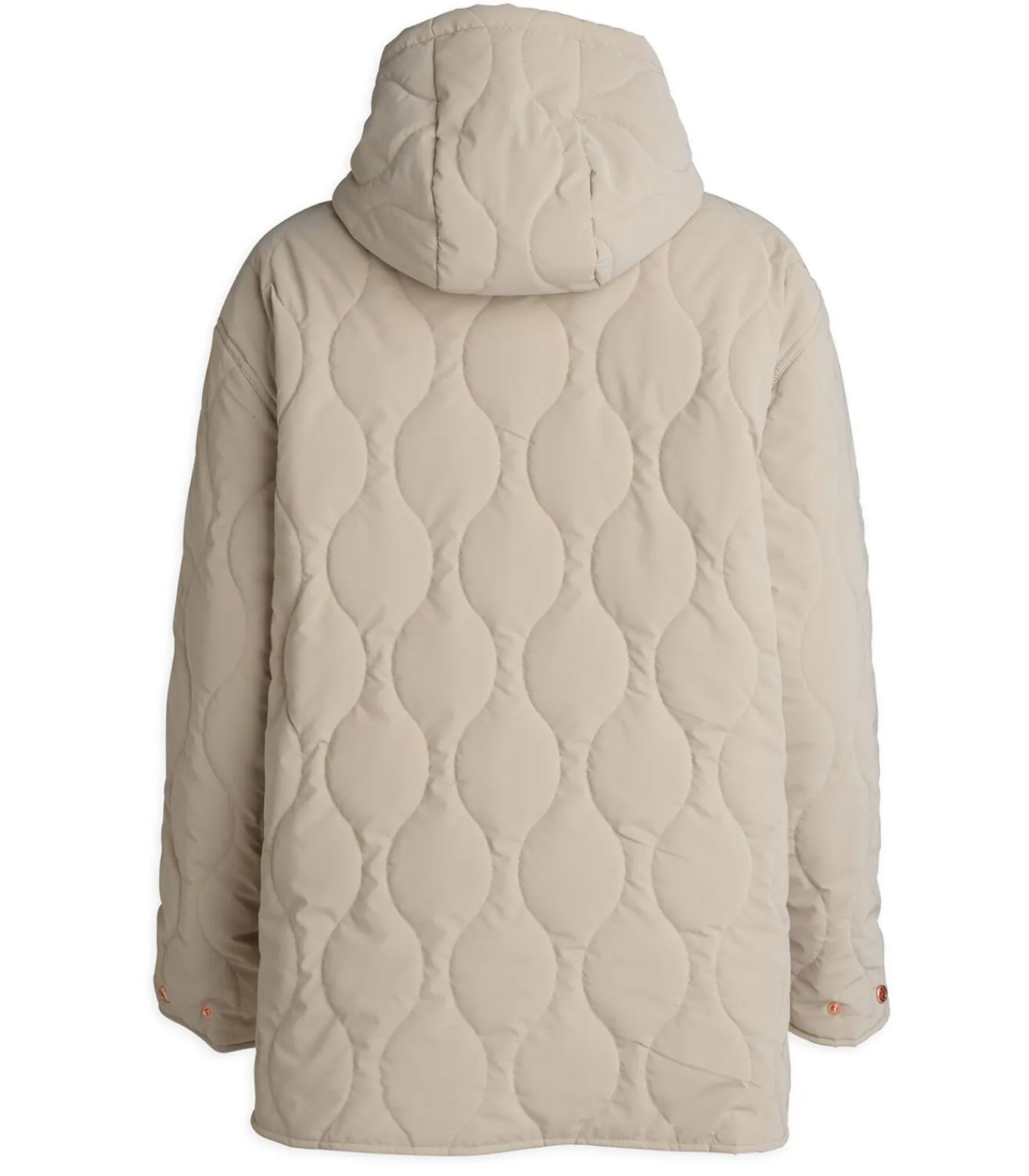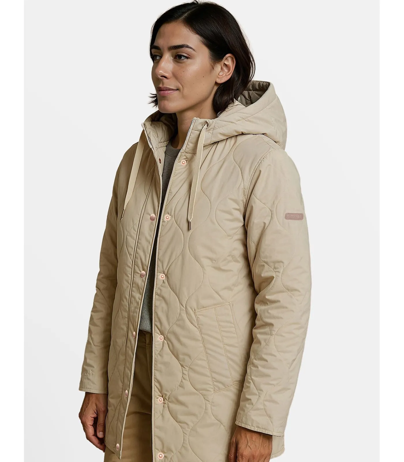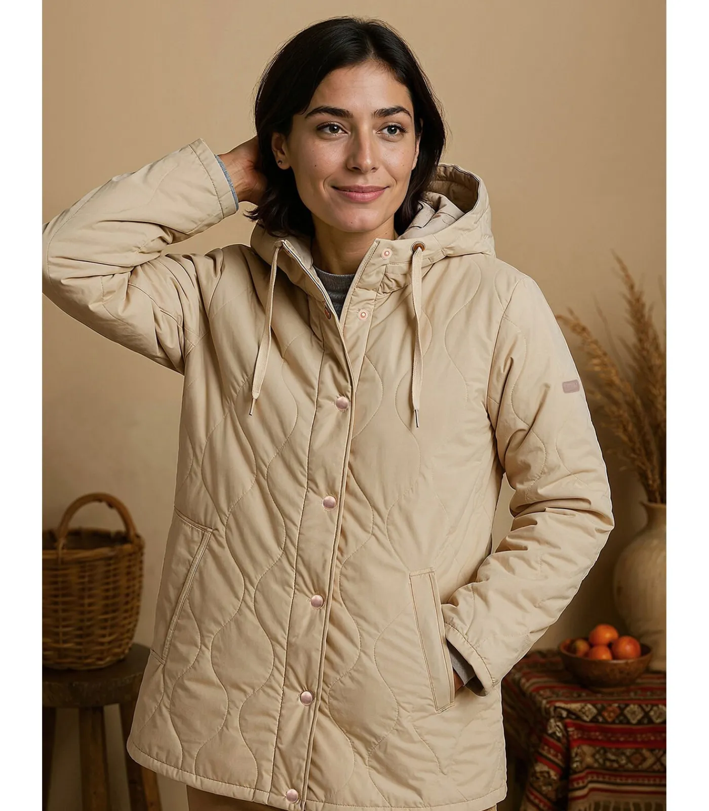Ga voor een trendy en comfortabele look met deze beige jas met een stijlvol puffereffect, geïnspireerd op het thema Laguna Parón. Gemaakt van 100% polyester, biedt deze jas warmte en lichtheid. De uitlopende snit en lange mouwen zorgen voor een flatterend silhouet, terwijl de ritssluiting met contrasterende afwerking en knopen een extra vleugje stijl toevoegt. De zijzakken en capuchon met trekkoorden dragen bij aan de functionaliteit van deze jas. De J&JOY–patch op de linkerarm getuigt van zijn authenticiteit. Perfect om koele dagen stijlvol tegemoet te treden, is deze jas een must–have in je garderobe. Bestel nu en voeg een onmisbaar item toe aan je outerwearcollectie.