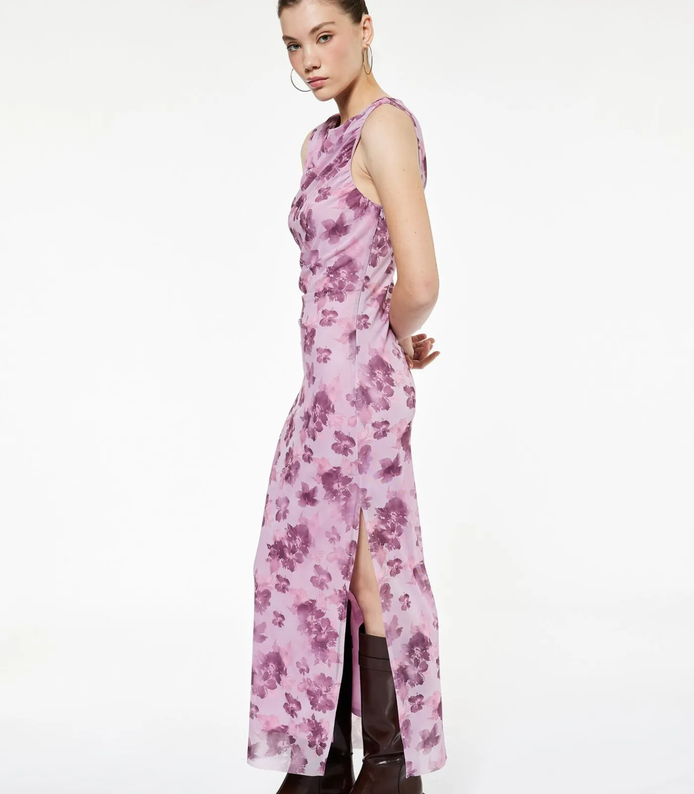 Deze elegante lange bloemenjurk combineert moderne stijl met tijdloze charme. De ronde hals en mouwloze afwerking geven de jurk een verfijnde uitstraling, terwijl de gedrapeerde details zorgen voor een dynamische look. Perfect voor zowel dagelijkse gelegenheden als speciale evenementen. Voeg minimalistische accessoires toe voor een stijlvolle look of een spijkerjack voor een casual toets.