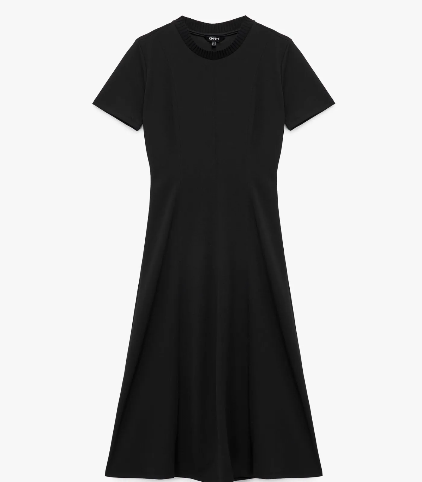 Deze stijlvolle zwarte midi–jurk is perfect voor diverse gelegenheden. Met een slanke pasvorm en korte mouwen biedt hij zowel comfort als elegantie. De ronde hals geeft de jurk een klassieke uitstraling, ideaal voor zowel casual als formele gelegenheden. Combineer met je favoriete accessoires voor een complete look.