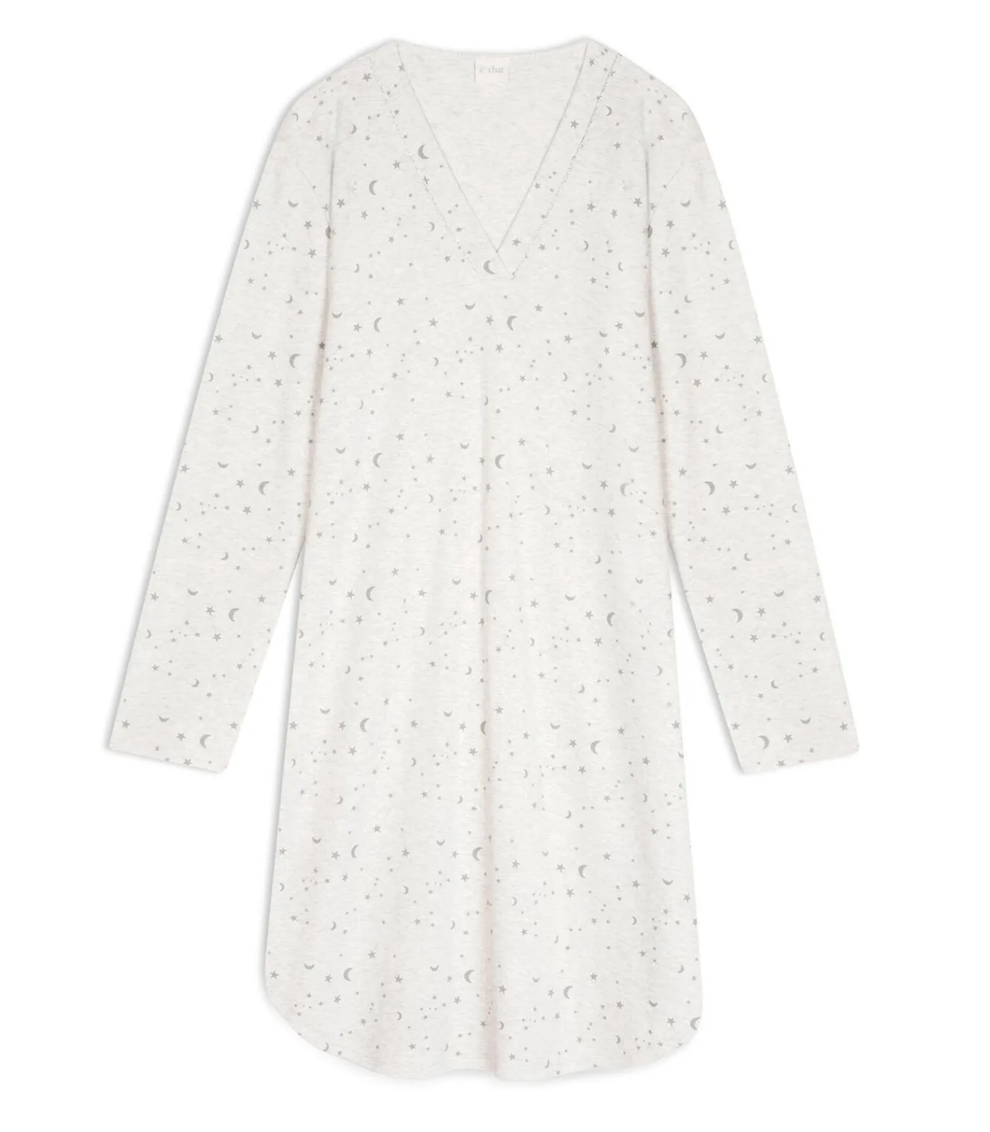 Het valt op door de zorgvuldige afwerking en de sterrenbeeldprint van de Grote Beer, die een dromerige touch toevoegt aan vredige nachten. Het Luna nachthemd is verkrijgbaar in twee uitvoeringen: gouden print op een ecru achtergrond of donkergrijs op heidegrijs. Maak je nachtkleding compleet met een kamerjas, badjas of Essential jas om je ’s nachts warm te houden. Kom gewoon uit bed.