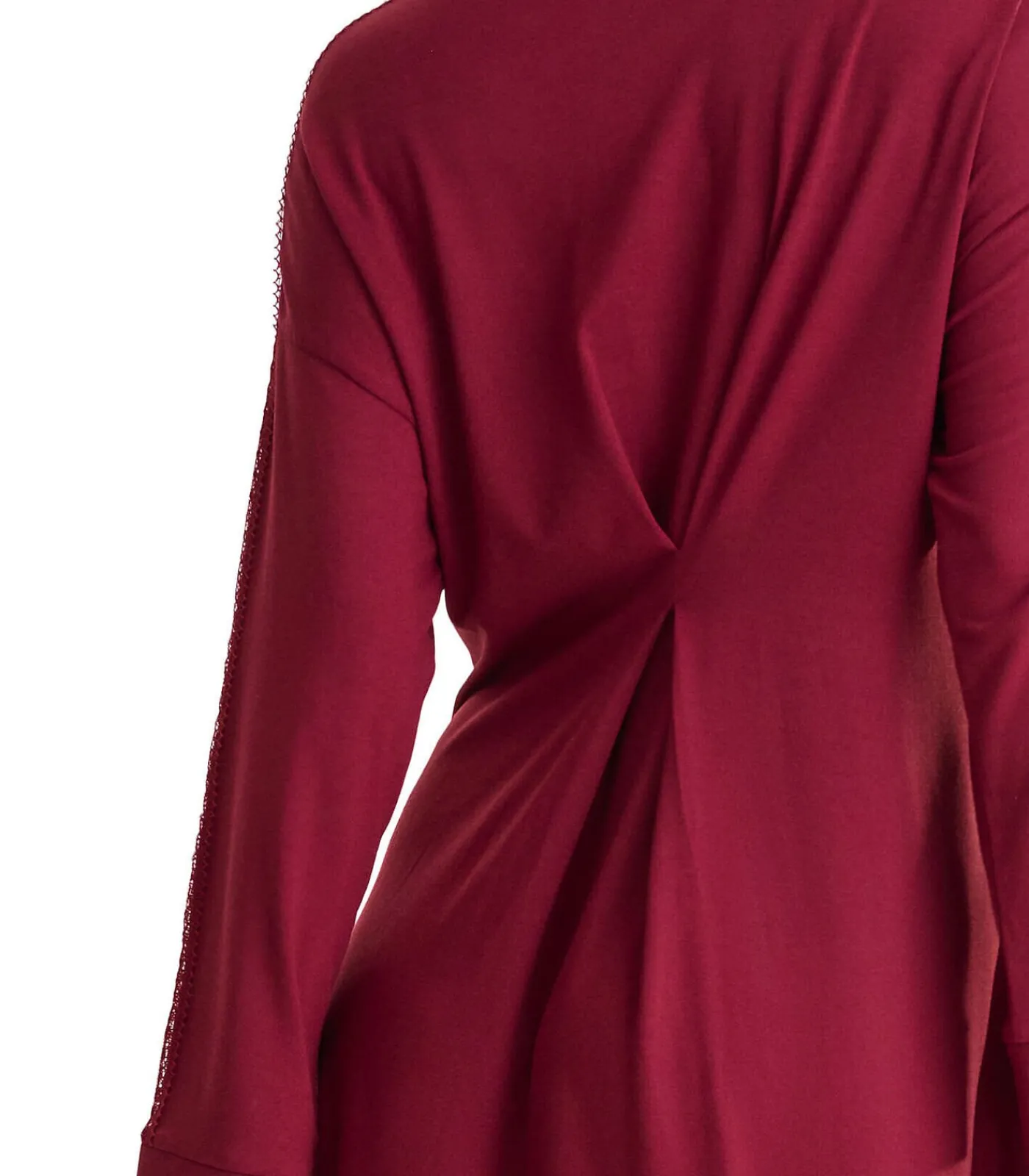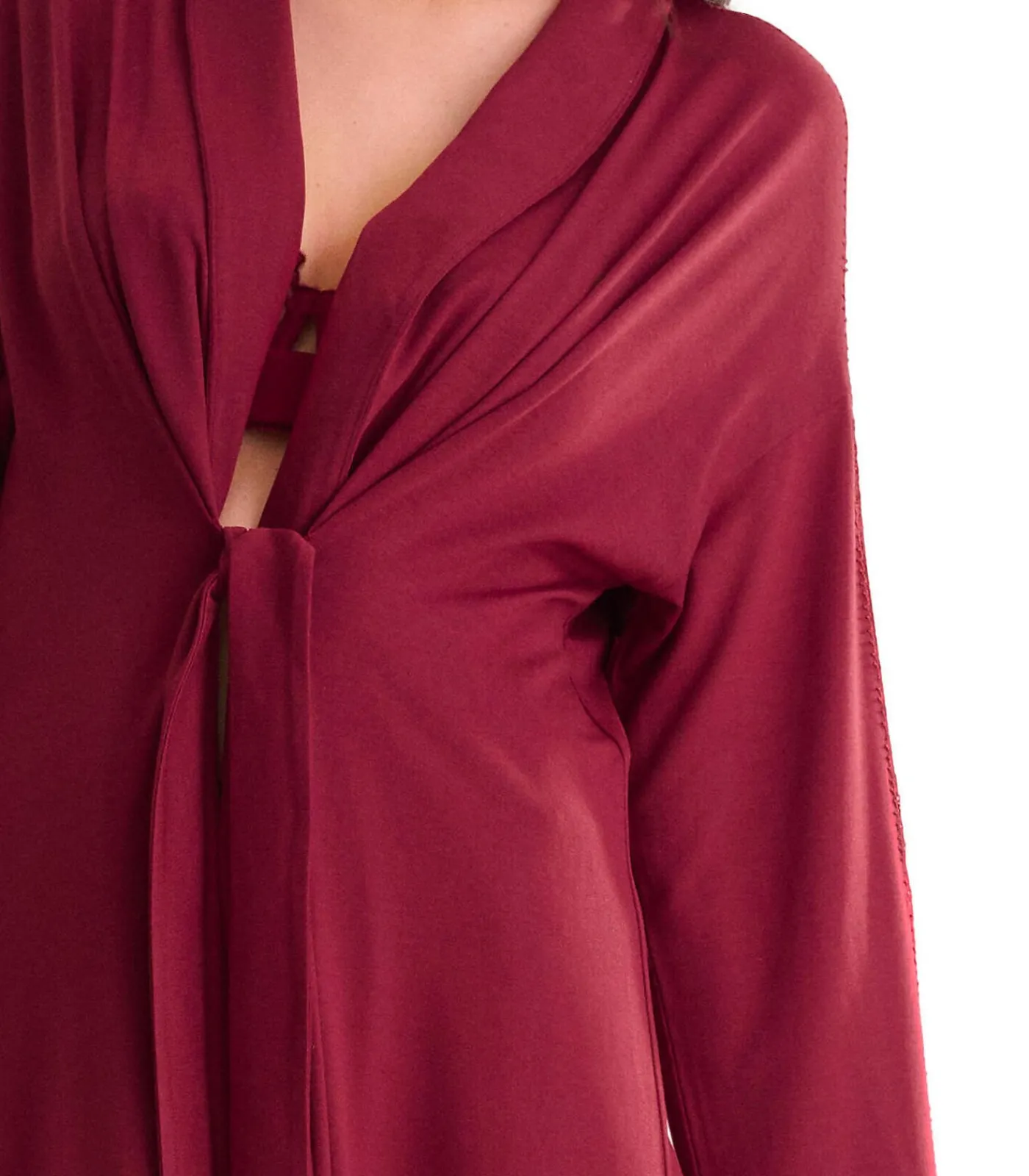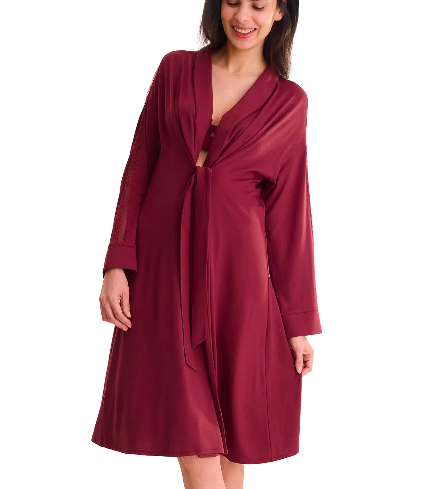 Negligé met lange mouwen, sjaalkraag en sluiting net boven de taille. Ingenaaide plooien aan de voorkant, zijkanten en middenachter creëren een elegante lijn. Fijn kant langs de mouw zorgt voor een subtiele decoratieve touch. Lengte ca. 100 cm.