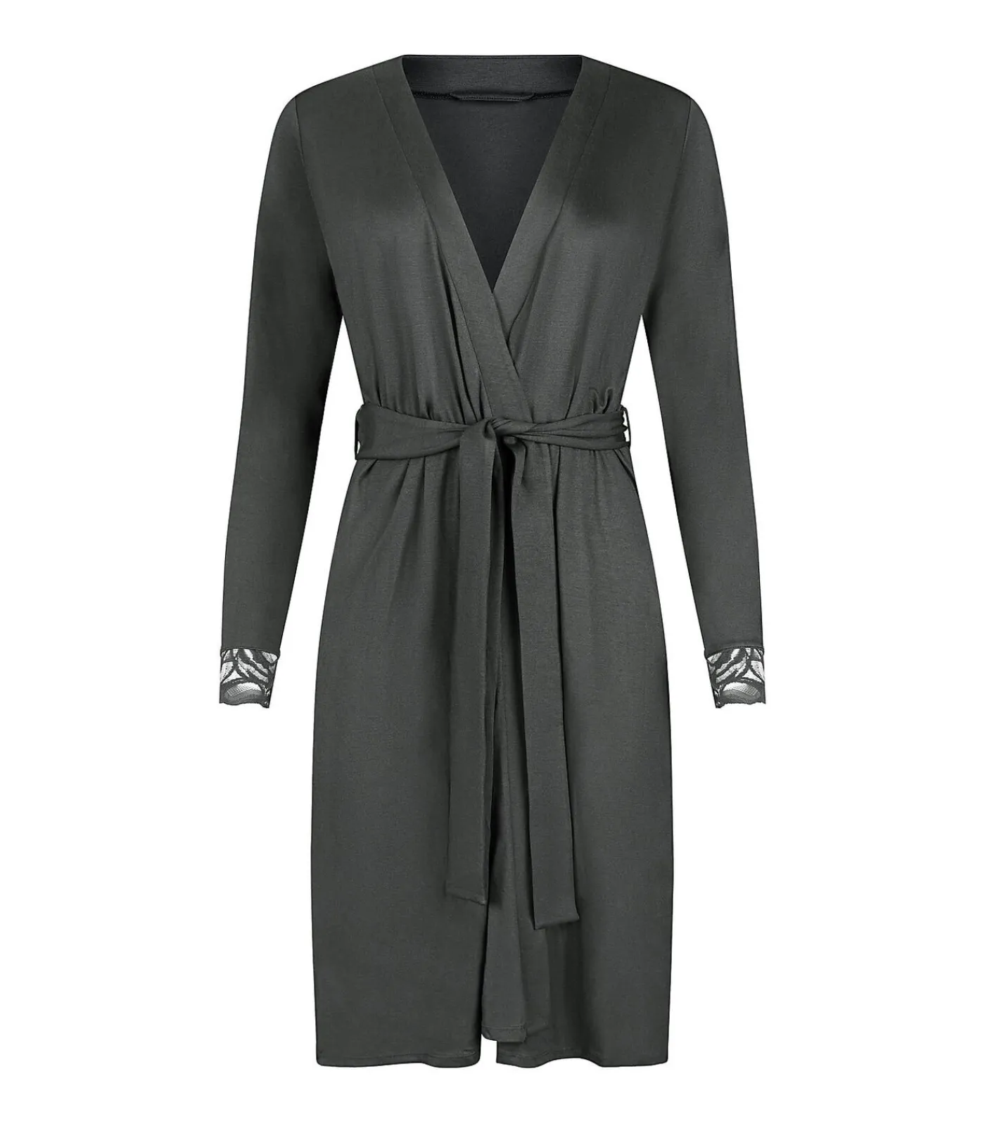 Negligé met lange mouwen in een comfortabele, elegante snit. Kanten details op de mouwen en praktische ceintuursluiting. Lengte ca. 100 cm.