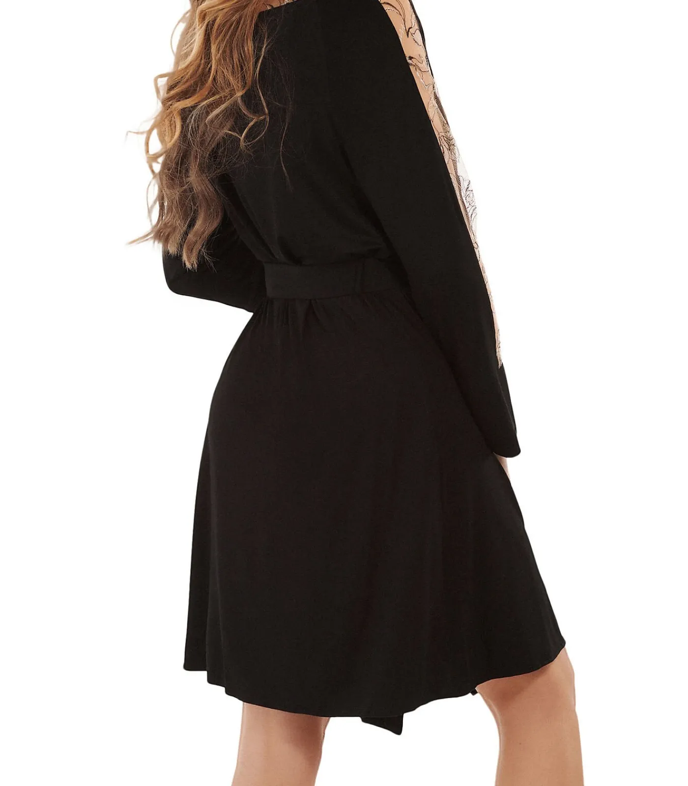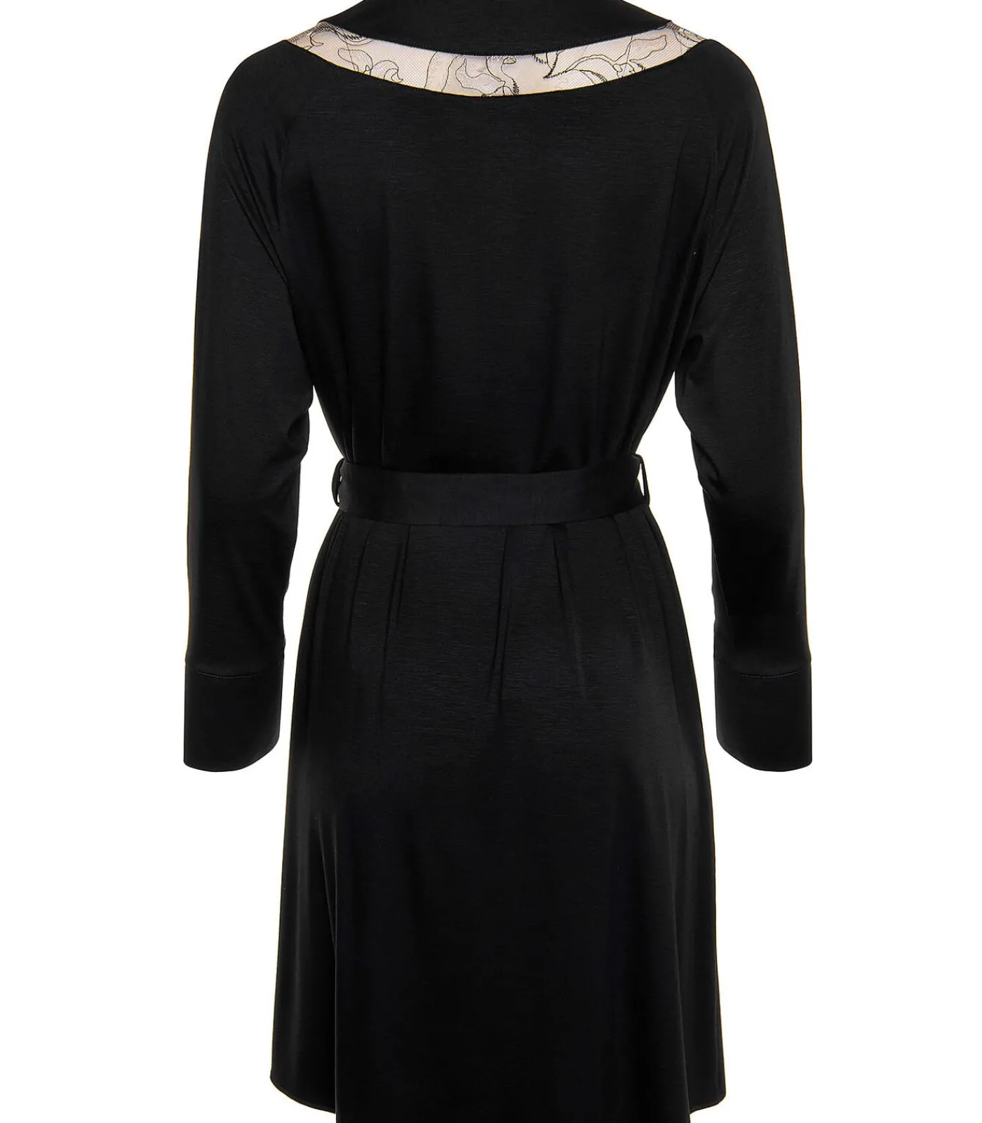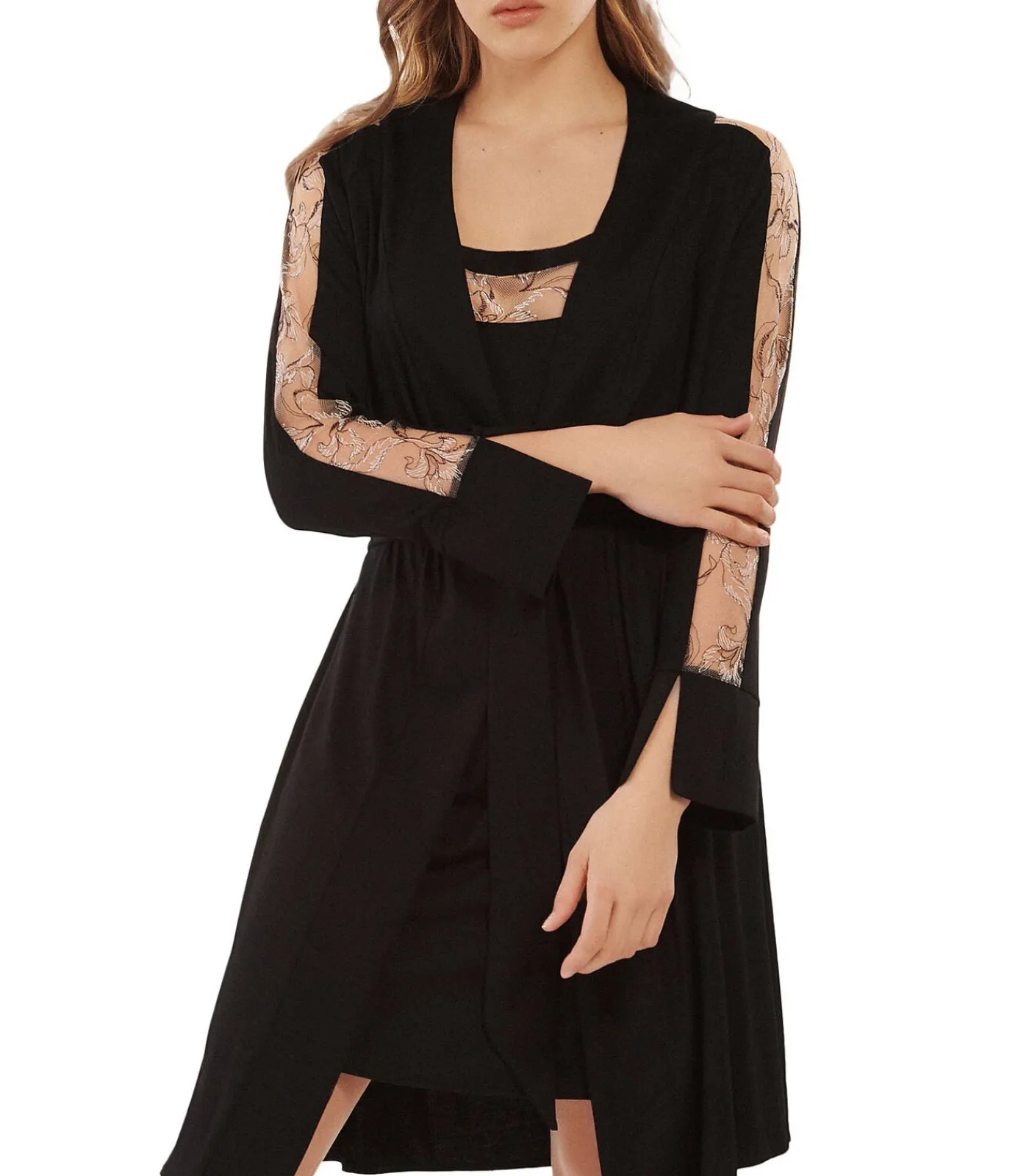 Elegante negligé met geborduurde inzetten langs de mouwen en op de rug voor een luchtigere look. De mouwen zijn afgewerkt met een brede zoom en een split, en een brede ceintuur kan rond de taille worden geknoopt. Het borduursel speelt met transparantie voor een verleidelijke look. Lengte ca. 95 cm.