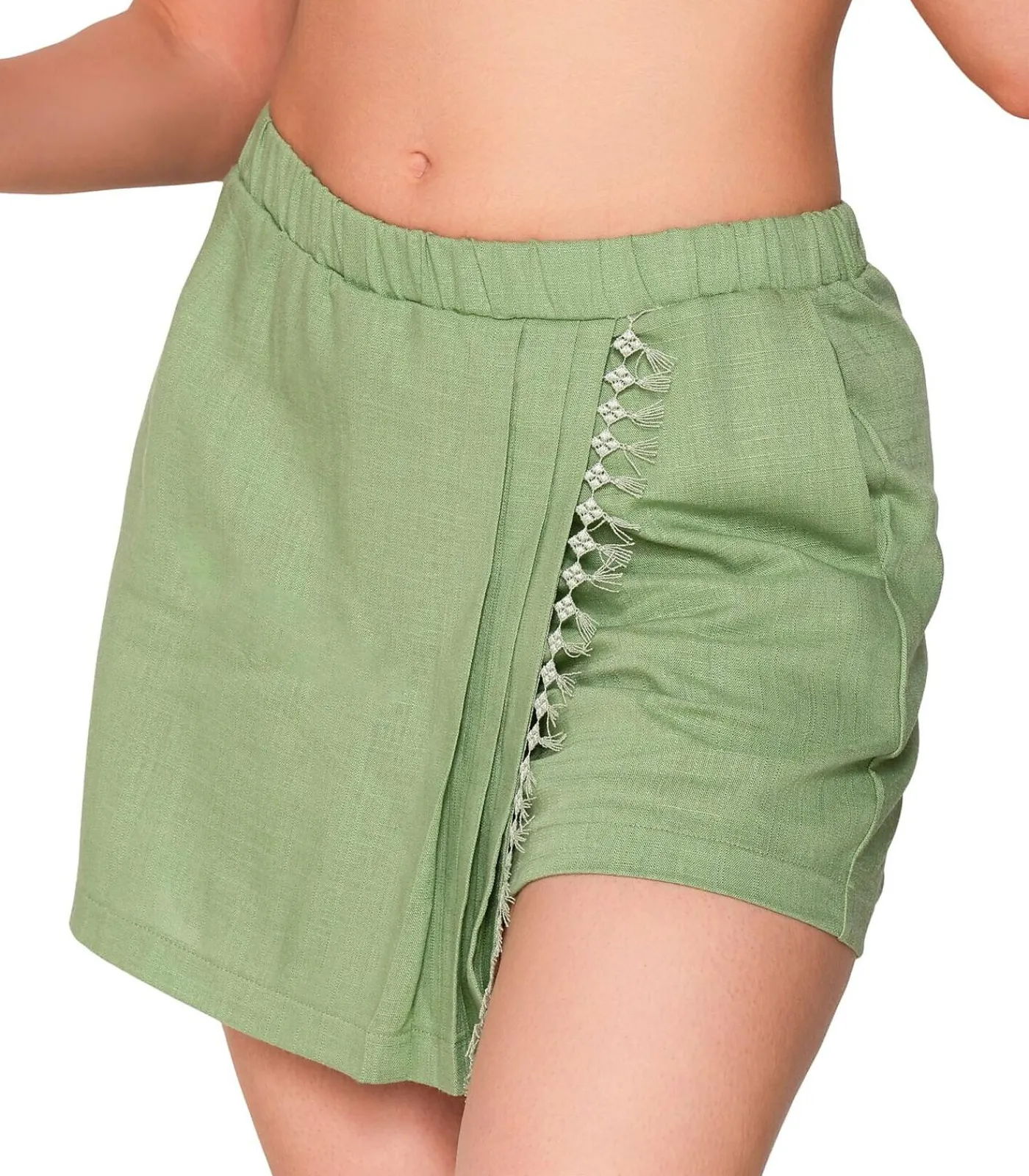 Casual maar vrouwelijke shorts gemaakt van een mix van linnen en rayon, ideaal voor de warmere maanden. Het model is slip en vloeiend, met een portefeuilleffect aan de voorkant, waardoor het van voren gezien op een rok lijkt. Elastische tailleband voor een comfortabele, gemakkelijke pasvorm. De linkerkant van de voorkant is versierd met een decoratieve band met kwastjes voor een elegante, handgemaakte touch. Deze shorts zijn ideaal om te dragen als strandkleding of voor een casual en stijlvolle zomeroutfit.[Shorts worden apart verkocht. Topje en broekje worden apart verkocht. Het topje, de sieraden en andere accessoires die het model op de foto’s draagt, zijn niet inbegrepen].