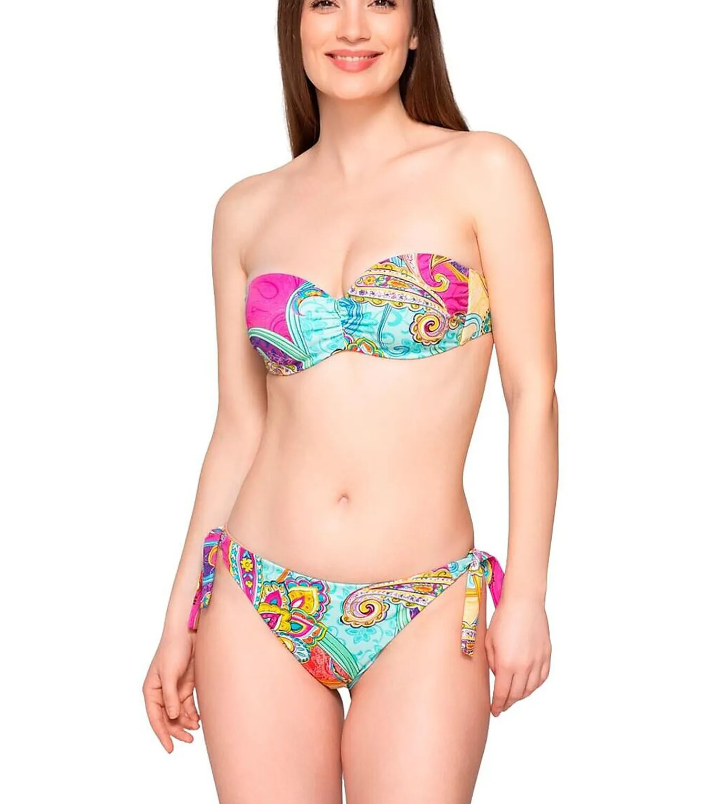 Klassiek vrouwelijke zwembroek met lage taille en knopen aan de zijkanten voor een persoonlijke pasvorm. Het levendige, gedetailleerde patroon is perfect voor vakanties of een levendige strandlook. Het combineert arabesken, op paisley geïnspireerde rollen, bloemvormen en spiraalelementen in een helder kleurenpalet. Het roept een bohemien, zomers gevoel op, met een chique psychedelisch tintje voor wie van originele, kleurrijke badmode houdt. Zachte polyamide stof biedt duurzaamheid en elasticiteit voor maximaal comfort.[Zwempakje wordt apart verkocht. Topje en zwembroekje worden apart verkocht. Topje, sieraden en andere accessoires die het model op de foto’s draagt, zijn niet inbegrepen].