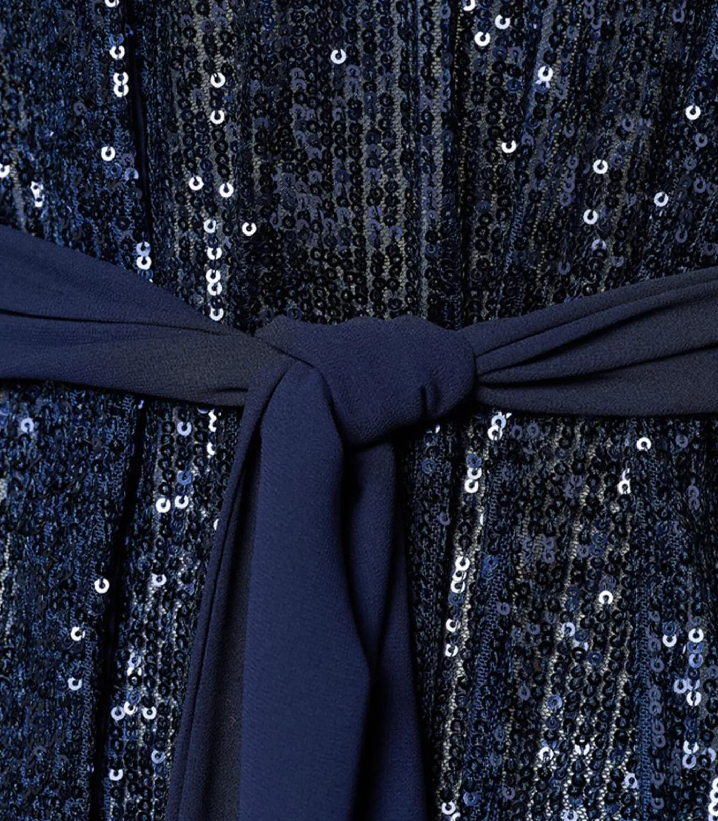 Maak een stijlvolle indruk met de navy pailletten tuniek, een ontwerp dat luxe en draaggemak samenbrengt. Het knielange model is rijkelijk versierd met glinsterende donkerblauwe pailletten die prachtig fonkelen op een diepe blauwtonige basis. De soepele pasvorm zorgt voor een elegante, comfortabele uitstraling. De taille kan verfijnd worden geaccentueerd met een donkerblauw strikceintuur in contrasterende stof, dat gemakkelijk verwijderd kan worden voor een meer ontspannen look. De lange mouwen met aangesloten manchetten en een licht pofeffect geven de tuniek een moderne, vrouwelijke twist. De blinde knoopsluiting en losse slip–onderjurk zorgen voor extra draagcomfort. Met zijn subtiele glans en knielange lengte is dit een veelzijdig kledingstuk dat perfect past bij chique diners, feestelijke gelegenheden en avondelijke events.
