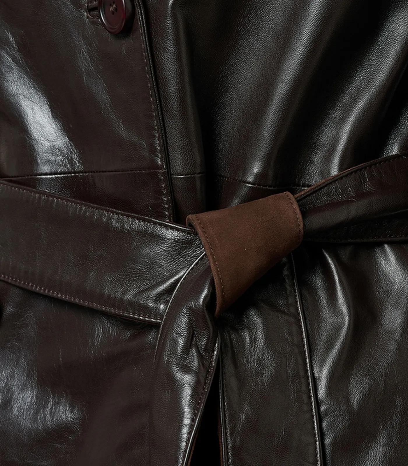 De leren trenchcoat is een veelzijdige en stijlvolle keuze die elk seizoen gedragen kan worden. Dit donkerbruine model is gemaakt van soepel leer van topkwaliteit dat zacht aanvoelt en mooi valt. Het klassieke design bevat een reverskraag, dubbele rij knopen en comfortabele steekzakken, wat de jas een gestructureerd en verfijnd karakter geeft. De rechte pasvorm kan met de strikceintuur eenvoudig worden geaccentueerd. Met een lengte tot op de kuit en het gebruik van duurzaam leer heeft deze jas een tijdloze en luxueuze uitstraling. Creëer een chique look door hem te combineren met de Cherbrough–trui in donkerbruin en de bijpassende Torya–pantalon in bruin. Voor een modieus statement draag je hem met de Caitlin metallic top in brons en de donkerbruine leren Delilah–rok. De Lyana trenchcoat in donkerbruin is de perfecte mix van klasse, comfort en tijdloze elegantie.
