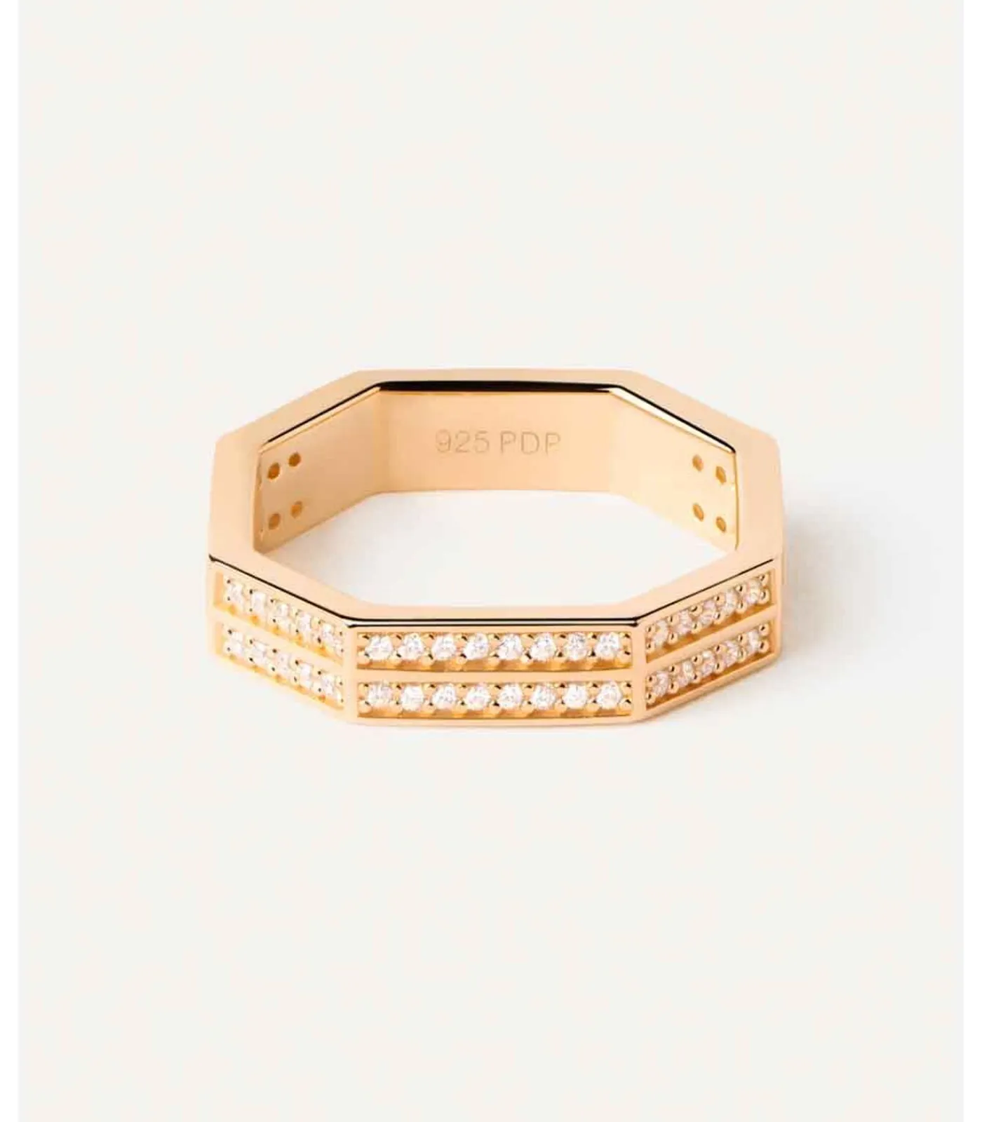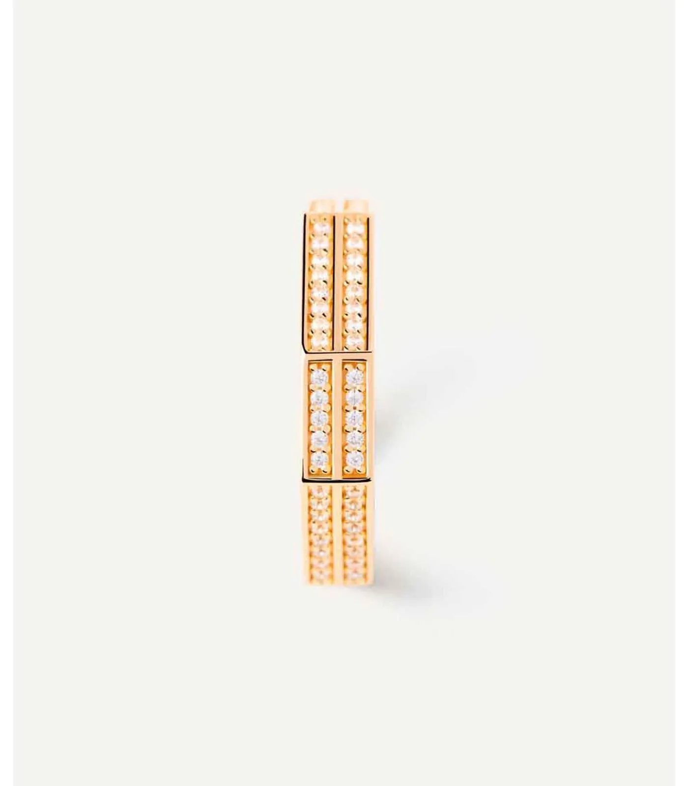GANCE EN SOPHISTIEK VOOR EEN MODERNE VERKLARING18–karaats vergulde ringen met gedurfde geometrische vormen en facetgeslepen zijkanten, met baguettestenen en ingelegde zirkonia. Kruisringen met drievoudige of dubbele band: een interessant laagjesspel waarbij de ene band de andere diagonaal overlapt.EEN INTEMPORAAL MODàˆLEMATERIAAL: sterlingzilverAfwerking: 18 kt verguldZirkonia’s: witte zirkonia’sSteendiameter: 1 mmRingdikte: 4,4 mmGewicht: 3,88 g