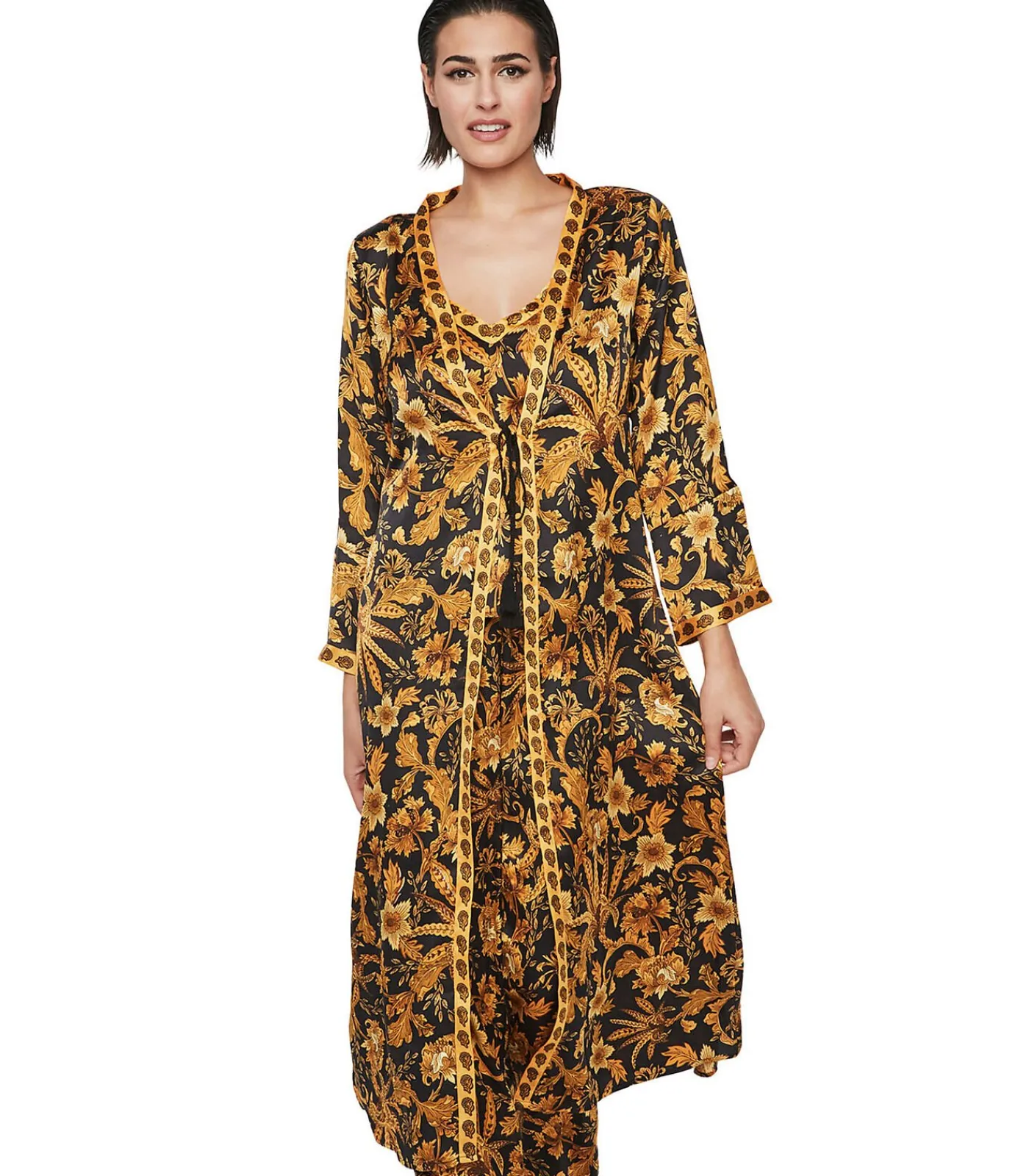 Prachtig negligé met lange mouwen en een koordje onder de buste, waardoor het aan de voorkant gedeeltelijk gesloten kan worden en een prachtige V–halslijn creëert. De rijke bloemen– en plantenprint in combinatie met levendige kleuren en randen in Provençaalse stijl brengt je terug naar een zomerse plattelandssfeer en helpt je de warmte van je zonvakantie te verlengen.[Jurk wordt apart verkocht. Pyjama’s en andere accessoires die het model op de foto’s draagt, zijn niet inbegrepen].