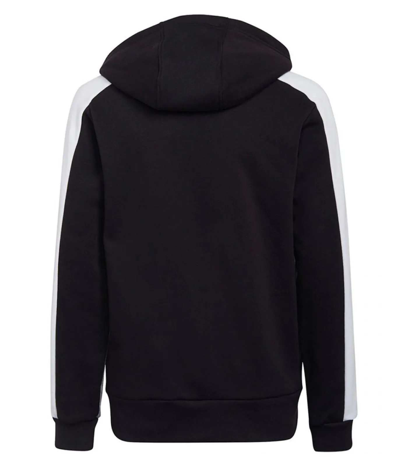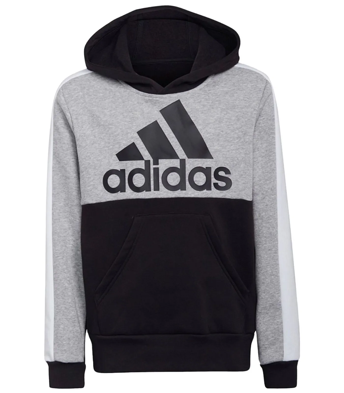 Adidas COLOUR BLOCK Zwarte T–shirt met kap, gemaakt van 70% katoen en 30% gerecycled polyester. De stof is gebreid met een zachte aanraking. Het ontwerp is Colour Block, versierd met logo en gestreept. Het heeft ribbed hem, kapitein halslijn, een t–shirt met lange mouwen, met ribbel manchetten en 1 kangoeroezak. De kleding kan aan de achterkant worden getrokken voor een goede passing. Grootte: 6 jaar (24 in.).