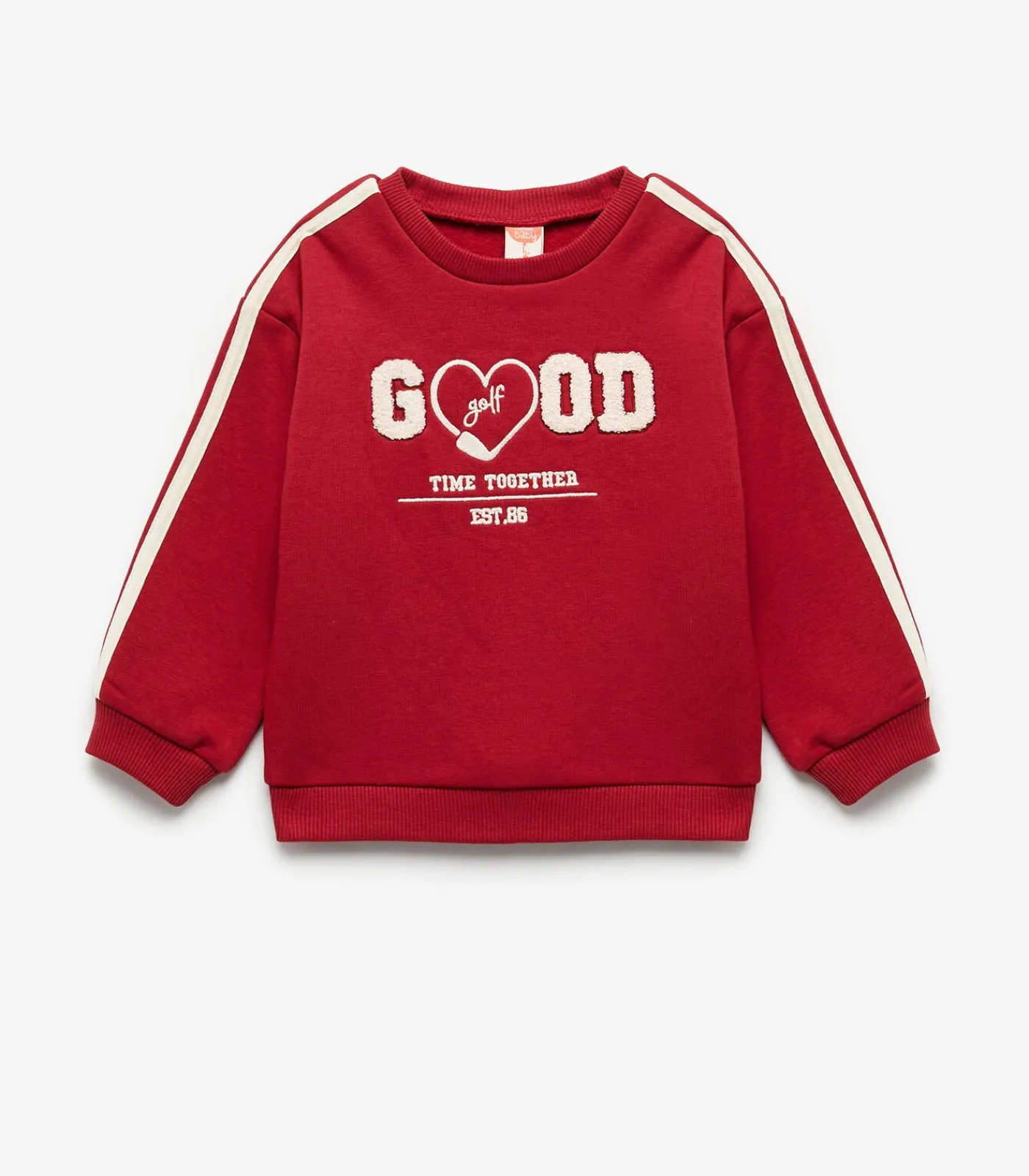 Koton Long sleeve soft interior stripe detail embroidered crew neck sweatshirt. With this outfit, your baby is safe. Our products are tested against chemicals and designed mechanically in compliance with all safety principles. They do not contain dyestuff and heavy metals which may be damaging for health or any small and sharp pieces, straps or laces that may be ingested.