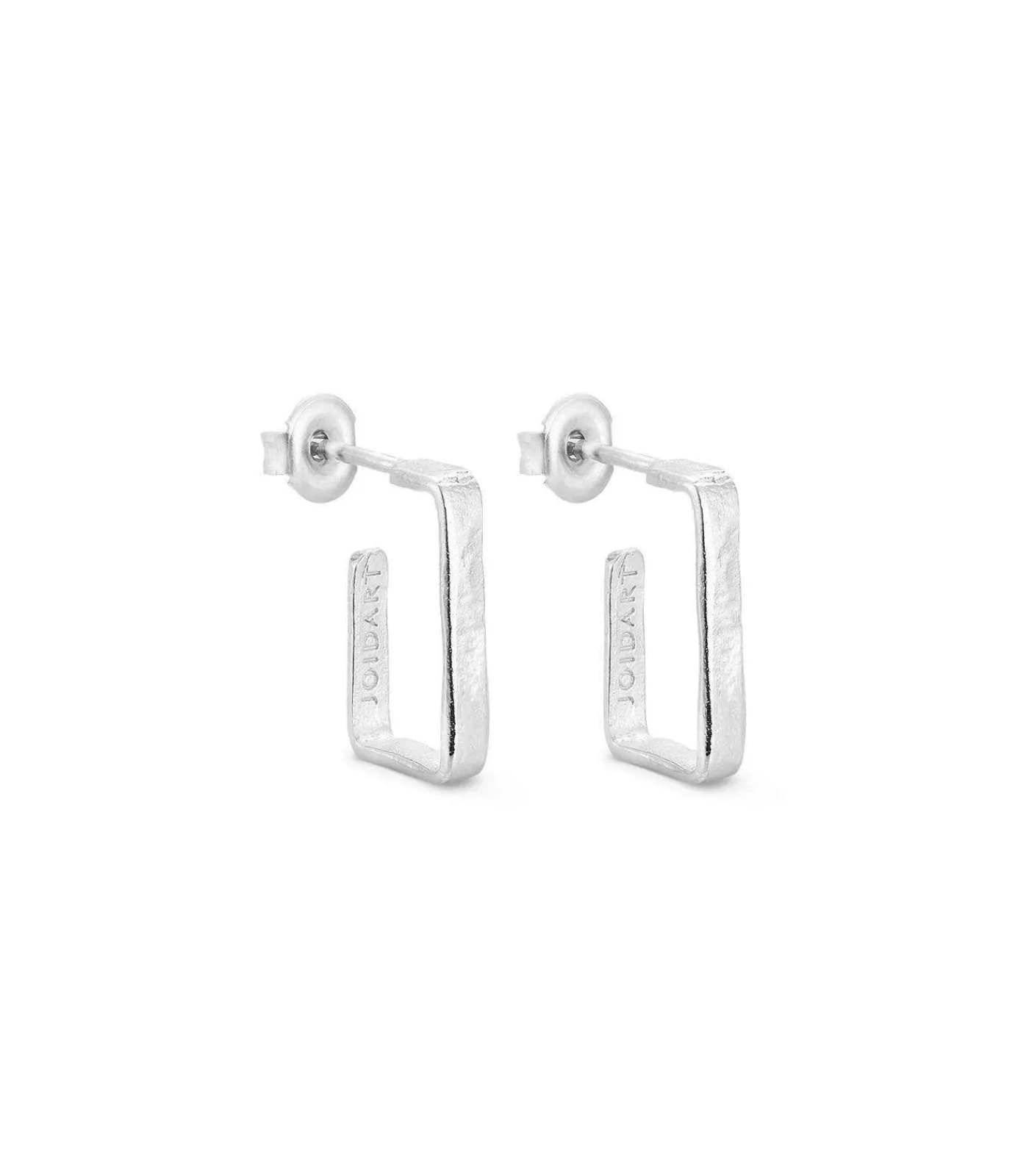 Kleine, rechthoekige oorbellen van mat glanzend 925 zilver met een platina coating. Smal ontwerp met texturen die doen denken aan de schors van sommige mediterrane bomen. Vlindersluiting.