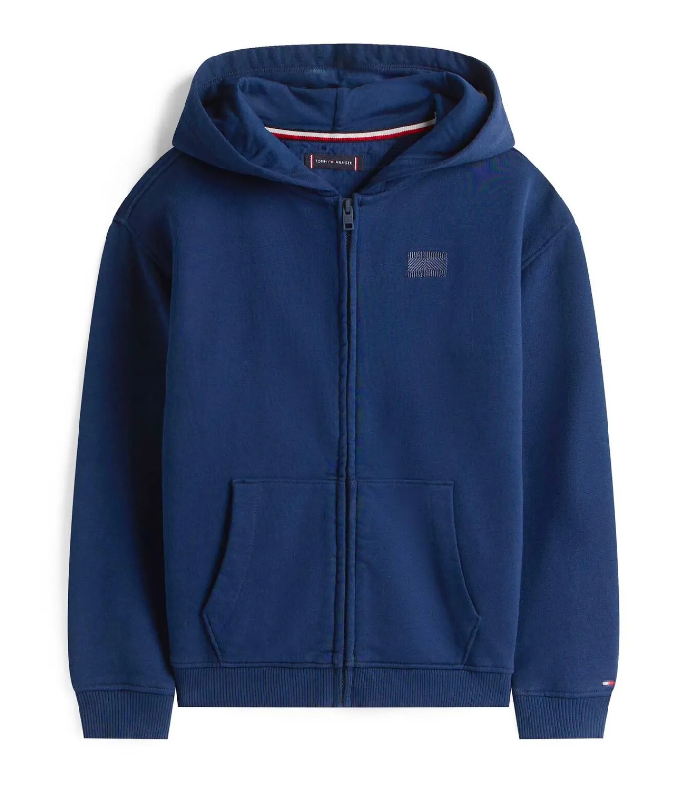 Kleur: Dark Night Navy Samenstelling: 100% katoen Mouwen: Lang Pasvorm: Normaal Sluiting: Volledige ritssluiting Details: Hoodie van puur katoen met volledige ritssluiting en split kangoeroezak. Afgewerkt met geribbelde zoom en manchetten, ton–sur–ton vlaggetjesborduursel op de borst en iconische details aan de binnenkant van de kraag. De licht verlaagde schouders maken de relaxte stijl compleet. Gebruik: Perfect voor casual en sportieve looks, ideaal voor school en vrije tijd met een vleugje Tommy–elegantie
