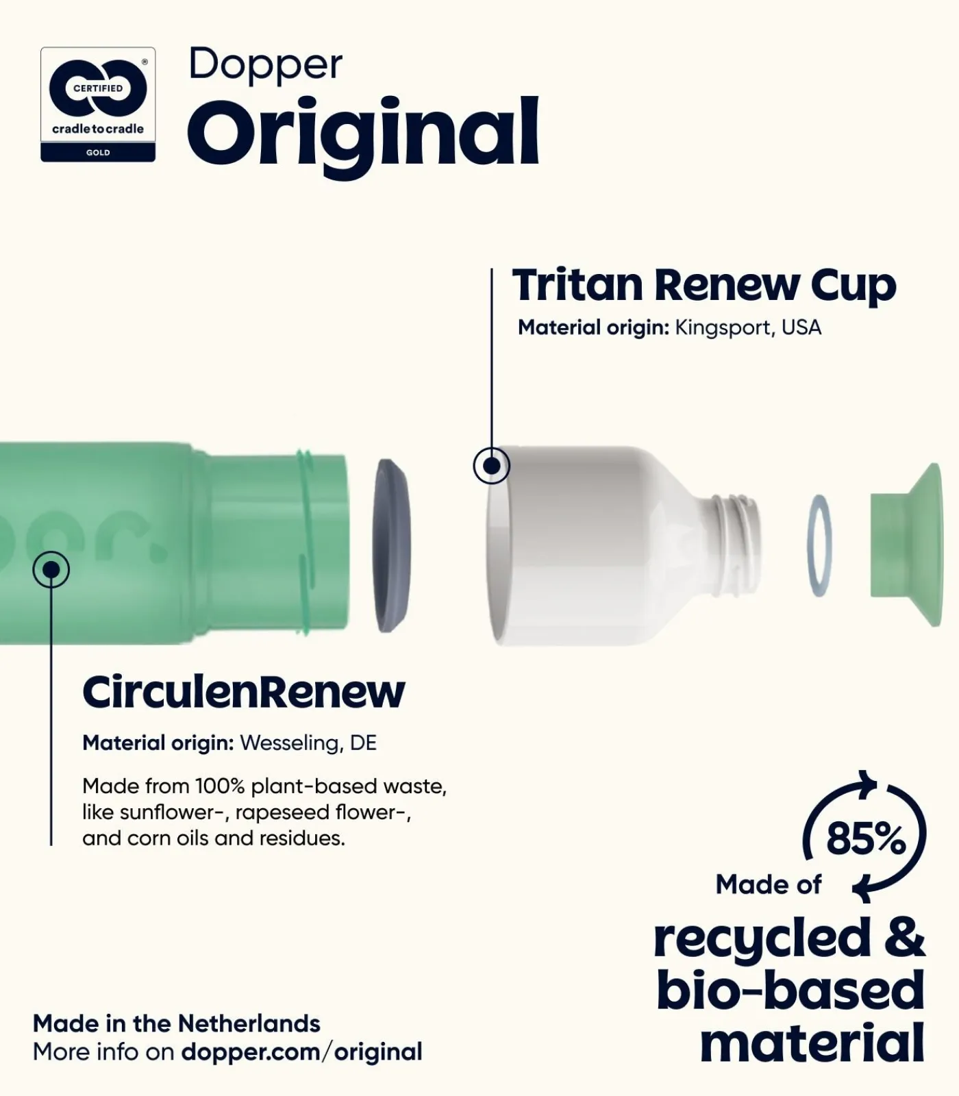 ’s Werelds eerste Cradle to Cradle Certified® Gold–flessencollectie: van ontwerp tot het einde van de levensduur voldoet jouw (zee)heldhaftige fles aan de strengste milieu–eisen en ethische normen.Geen CO2–voetafdruk: dankzij 85% geüpcyclede materialen en productie in een Nederlandse fabriek die op 100% hernieuwbare energie draait, laat de Dopper Original geen CO2–voetafdruk achter.Geen waterverspilling: tijdens de productie wordt water uit een gesloten systeem gebruikt zodat het niet in het milieu terechtkomt. 100% recyclebaar aan het einde van de levensduur.450 ml oceaanreddende perfectie, eindeloos navulbaar met kraanwater. De Dopper Original fles is vaatwasmachinebestendig (tot 65 °C), BPA– en ftalaatvrij en lichtgewicht, ideaal voor onderweg.Dopper is een Certified B Corporation: we gebruiken zakendoen als een kracht voor het goede. Elke verkochte fles vermindert plasticvervuiling en biedt toegang tot schoon drinkwater in Nepal.