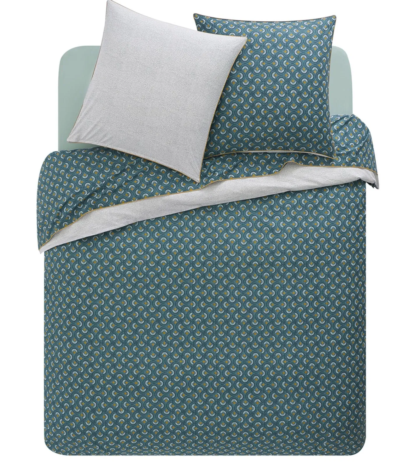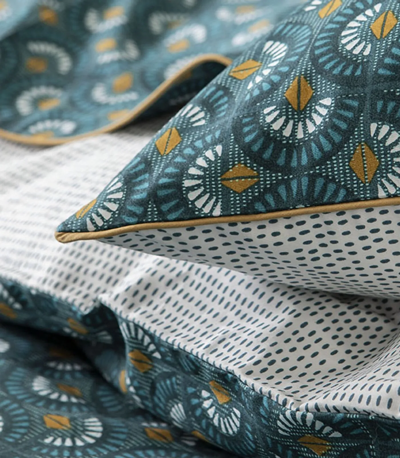 ECLIPSE is geïnspireerd op de stromingen Wax en Art Déco. Geometrische geprinte motieven, op een smaragdgroene achtergrond doen denken aan een subtiel ballet tussen de zon en de maan.