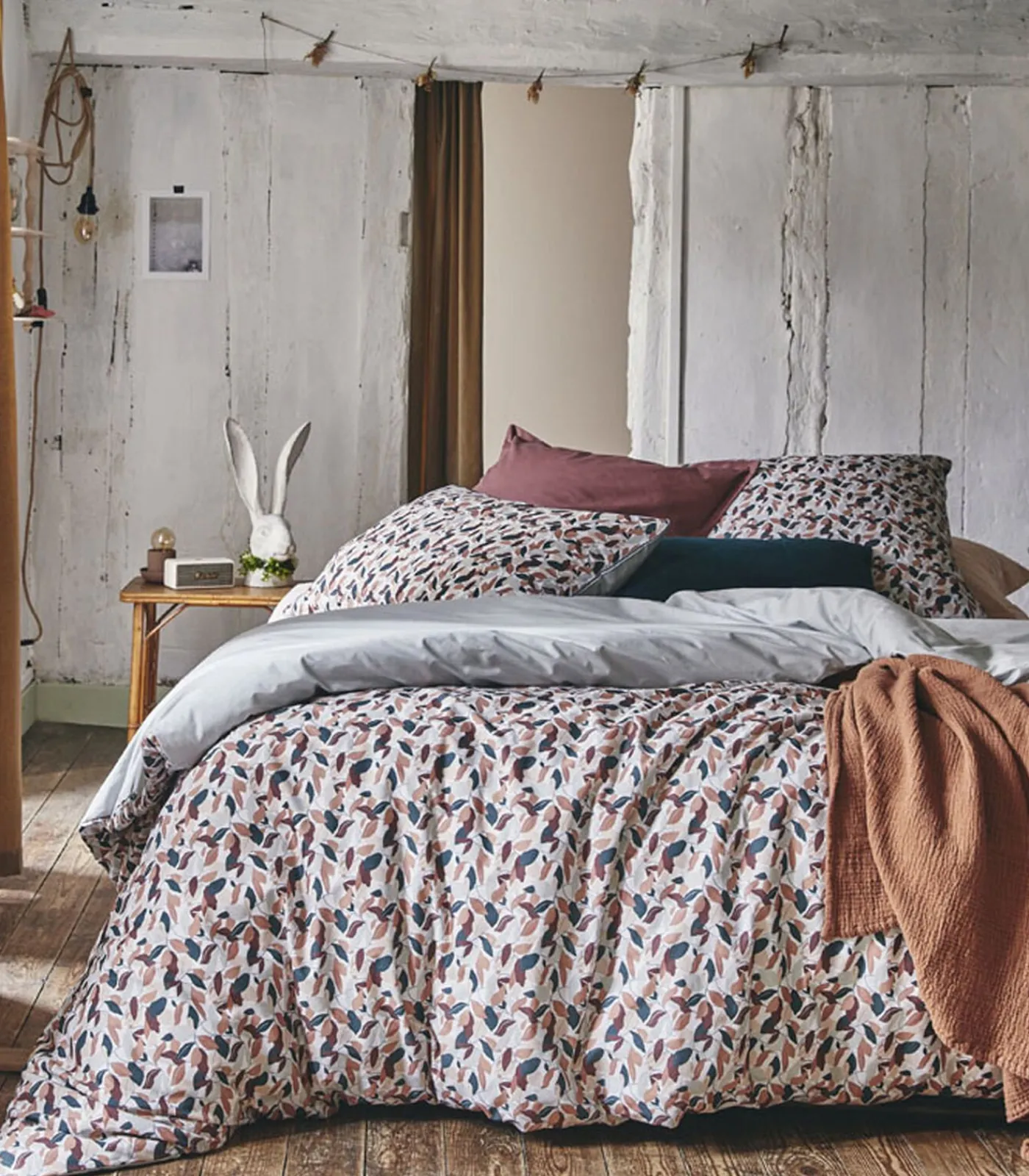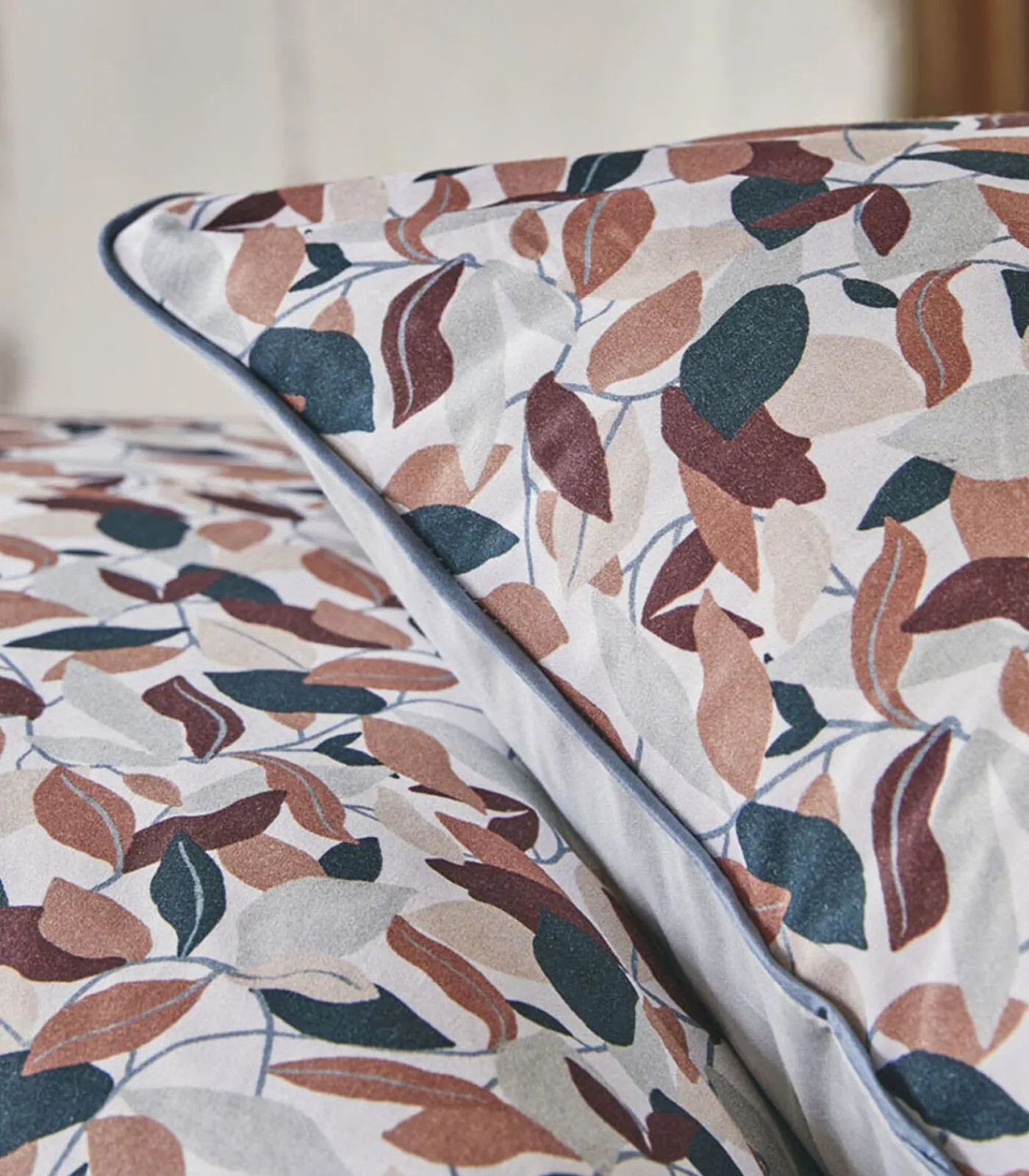 Het rustgevende model heeft een unieke zintuiglijkheid, en heeft een elegante balans van zacht en lichtgewicht materiaal. Nestel je in zeer aangename cocon. Hier lijkt het zacht gekleurde gebladerte aan een groot ballet begonnen te zijn. Dit model heeft een bedrukte voorkant en een effen grijze achterkant