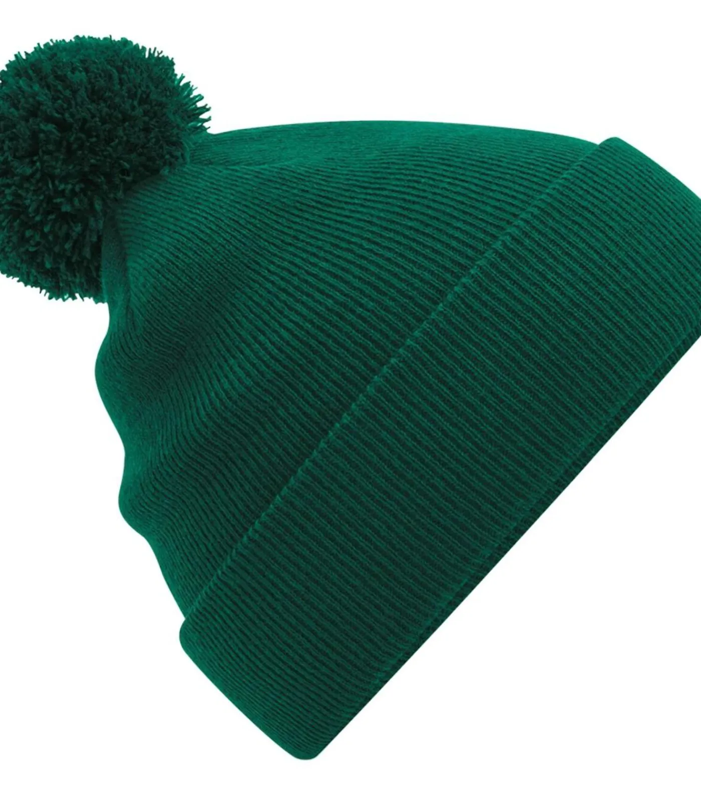 Beechfield–ORIGINAL van de merk Muts in donkergroen; geheel uit 100% acryl gemaakt. Het heeft een dubbellaags gebreide stof met zachte aanraking en een ontwerp met Pom Pom en geraafde patronen. Het etiket is los te scheuren en de manchet is omgeslagen. Het product is certificeerd volgens Amfori, BSCI en REACH voor duurzame praktijken.