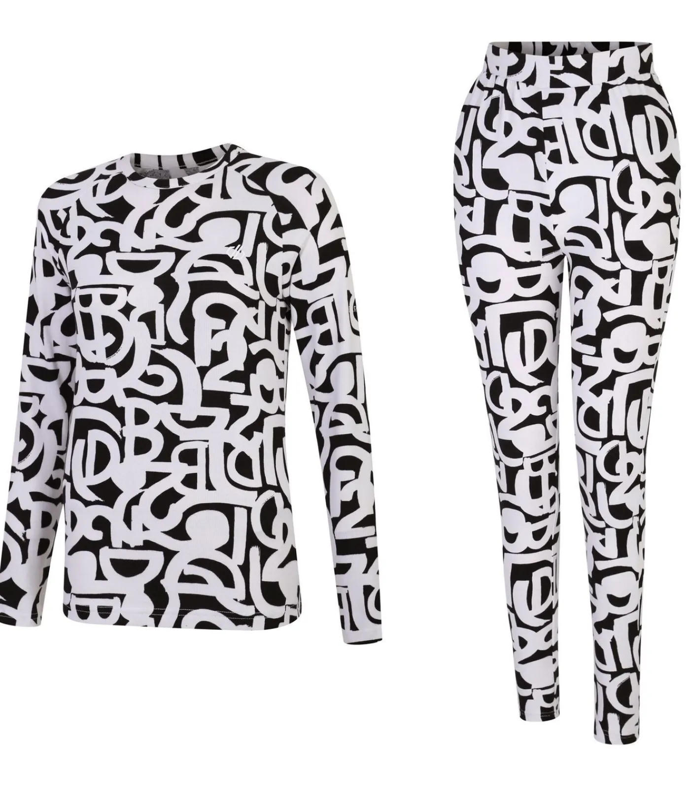 Dit productoverzicht geeft informatie over de Dare 2B Womens/Ladies Exchange III Graffiti Base Layer Set. De set bestaat uit een top met lange mouwen en een legging gemaakt van een mix van 93% polyester en 7% elastaan. Het geborstelde, zacht aanvoelende materiaal heeft een all–over graffitiprint met logo–elementen. De top met ronde hals en de legging hebben elastische taillebanden voor flexibiliteit en comfort. Extra prestatiekenmerken van de set zijn antibacteriële, sneldrogende en thermische eigenschappen om vocht af te voeren en de lichaamstemperatuur te reguleren tijdens het sporten. De leggings hebben een enkellengte voor volledige bedekking.