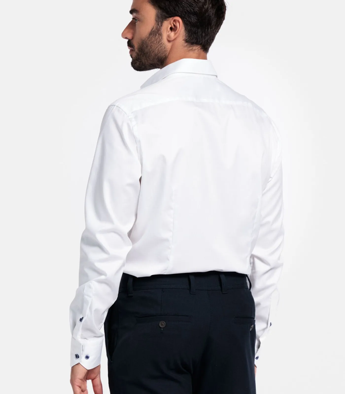 Tijdloos overhemd van Locarno, gemaakt van 100% two–ply katoenen twill van hoge kwaliteit. De semi cutaway kraag geeft het shirt een moderne, verzorgde uitstraling die zowel formeel als casual te dragen is. Dankzij de gladde twillstructuur voelt de stof zacht aan en blijft het overhemd mooi in vorm. Een veelzijdig item dat niet mag ontbreken in de garderobe van de moderne man.