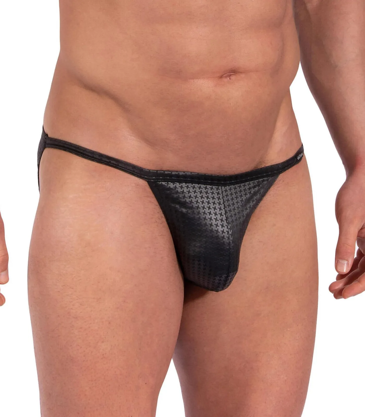 Mini ‘rio tanga’ snit met hoge dijen. Platte, lage tailleband met klein logo. Houndstooth–structuur versmolten met lichte, ademende jersey. Deze lichte stof, gebreid van fijne garens, heeft een warmtebehandeling ondergaan waardoor het zijn unieke houndstooth–patroon krijgt. Het mat–glanzende reliëf dat door de hitte ontstaat, zorgt voor een unieke look die nu een essentieel onderdeel is van de luxe casual klassieker van Olaf Benz. De bandje met reliëfopdruk en het Olaf Benz logo onderstreept het actieve, hoogwaardige karakter van de hele serie. Het product wordt gebreid in Italië en verwerkt in Duitsland. Het is dus een volledig Europees product, van ontwerp tot productie.