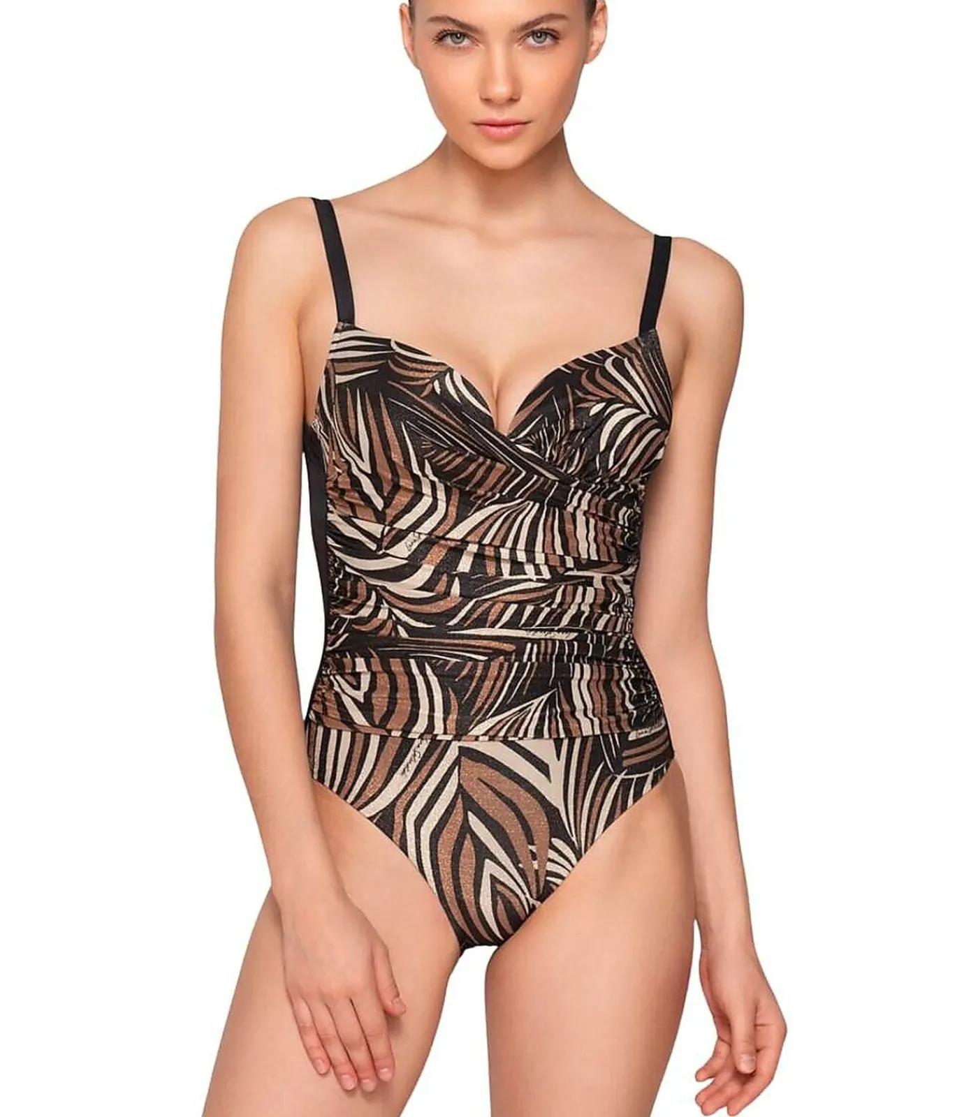 Dit eendelige zwempak is zowel elegant als flatterend. De sweetheart halslijn wordt benadrukt door een gekruiste drapering die de buste op een geraffineerde manier laat zien en tegelijkertijd goede ondersteuning biedt. De plooien bij de buik geven het een elegante touch en zorgen voor een afslankend effect. De stof is versierd met een exotisch lurexpatroon van palmbladeren in natuurlijke tinten voor een elegante wilde touch, gecombineerd met een satijnen zwarte stof aan de achterkant voor de ultieme zomerlook. De geschulpte achterkant voegt een sensuele allure toe zonder te onthullend te zijn. Gemaakt van speciale microvezel voor extra comfort, sneldrogend, bescherming tegen de zon en met de meest geavanceerde textieltechnologie. Het is een verfijnde, stijlvolle keuze, perfect voor wie houdt van natuurlijke prints en klassieke pasvormen die met elegantie opnieuw worden bekeken.