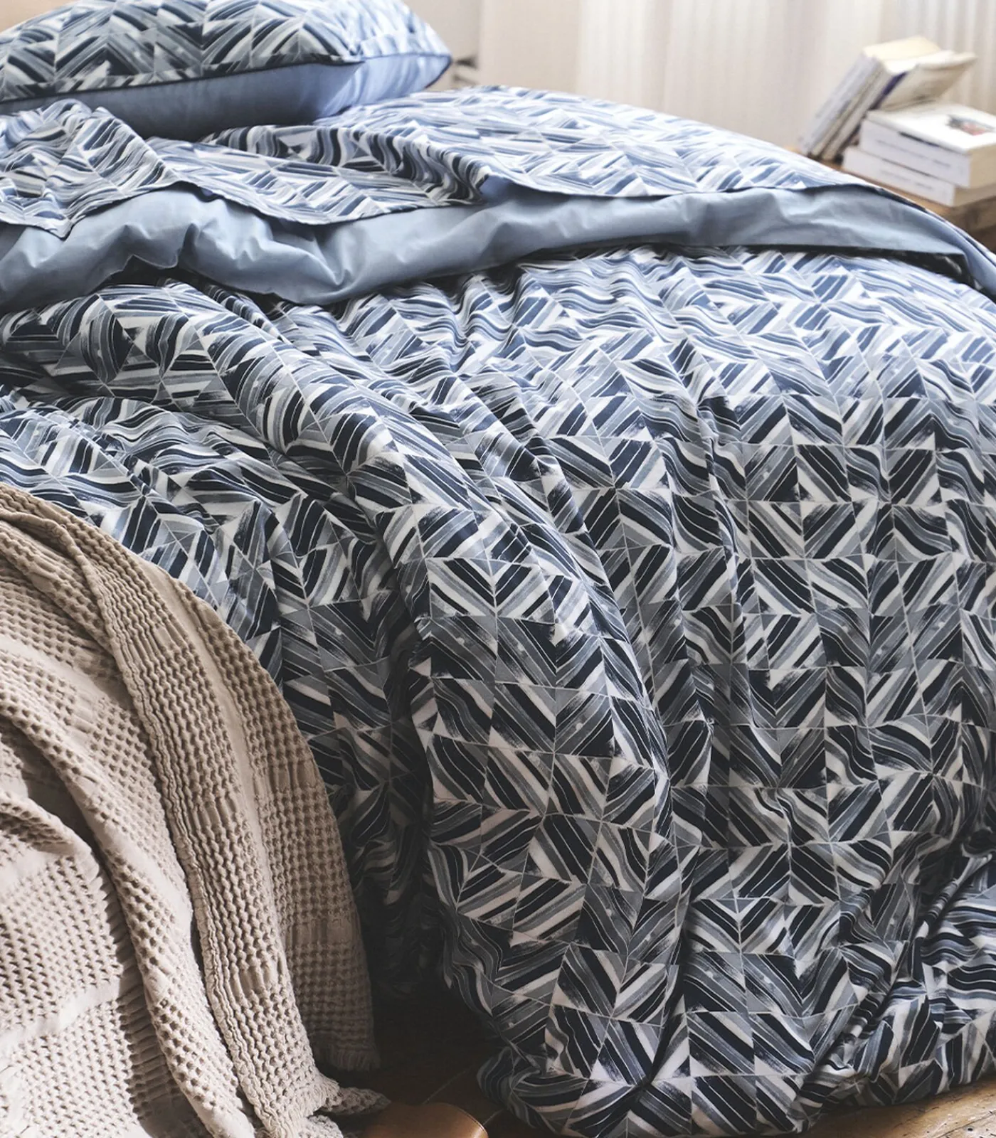 Bewonder de schoonheid van deze omgeving en duik onder in een hypnotiserende, rustgevende sfeer. Ons model Reflets van katoen perkal doet denken aan de licht verweerde randen van een zwembad. De blauwtinten, een echte weerspiegeling van het zwembad, worden vervormd door de rimpelingen en het licht. Reflets creëert een gedurfd decor dat de geest rustig laat wegdrijven. Dit hypnotiserende, betoverende beddengoed heeft een grijsblauwe achterkant die een extra dimensie toevoegt aan dit geheel.