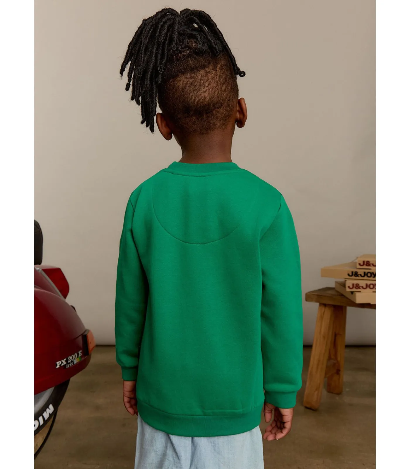 Geef je kleine jongen een casual look vol karakter met dit groene sweatshirt, geïnspireerd op de warmte en authenticiteit van Sicilië. Dit sweatshirt is gemaakt van 70% katoen en 30% gerecycled polyester en combineert comfort en duurzaamheid. De rechte snit en ronde hals zorgen voor een klassiek silhouet, terwijl de stijlvolle geribde randen een moderne touch toevoegen. Lange mouwen en stretch geribde randen en manchetten zorgen voor een perfecte pasvorm. Het speelse pizzapatroon op de voorkant voegt een vleugje originaliteit toe, terwijl de gegomde J&JOY–patch op de schouder de kwaliteit van het kledingstuk demonstreert. Bestel nu om uw kinderkleding aan te bieden die zowel trendy als comfortabel is.