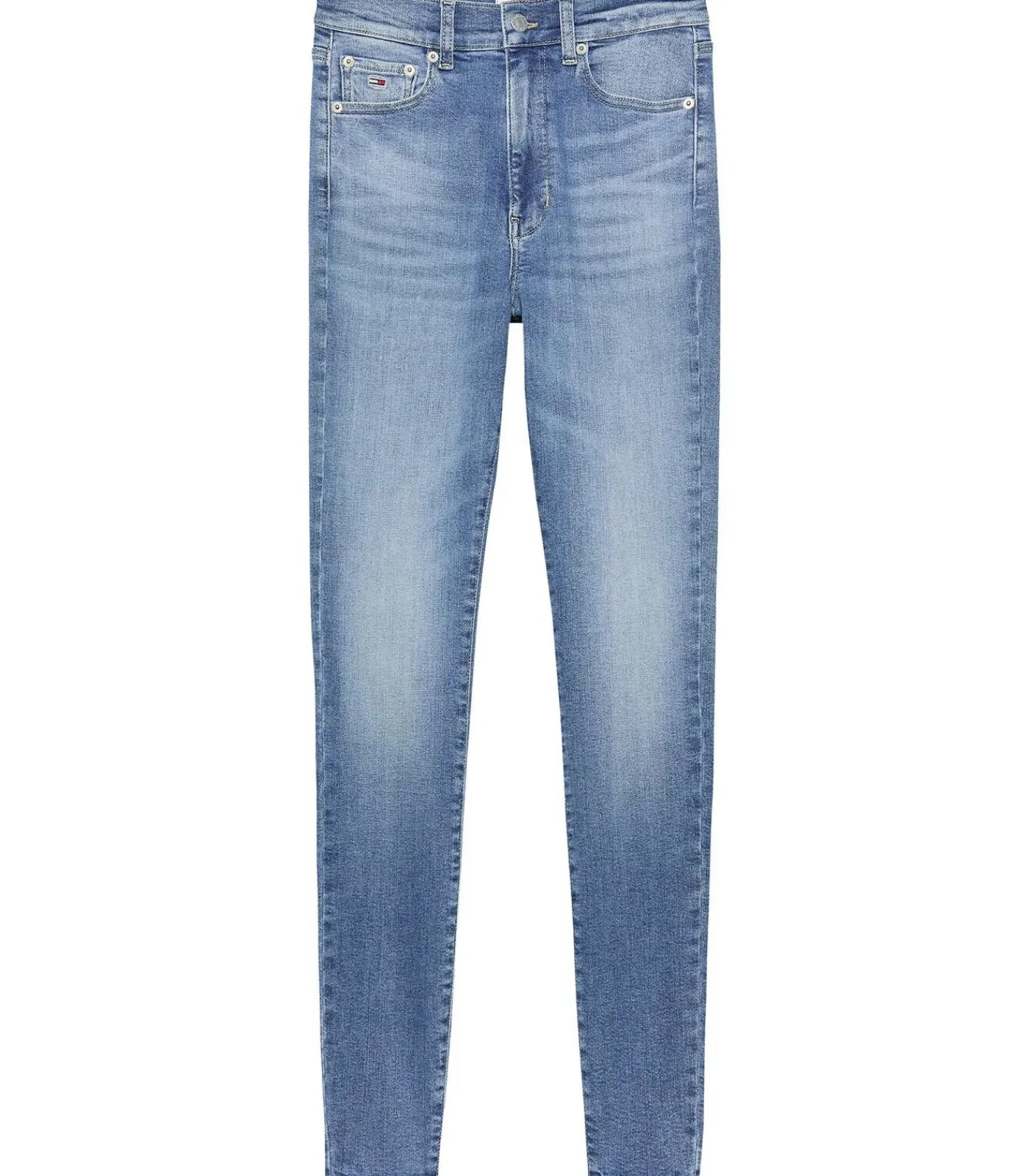 * Kleur: Denim Medium * Lengte: Normaal * Pasvorm: Skinny fit * Sluiting: Rits en knoop * Details: Vervaging aan de voor– en achterkant, kreuken op de dijen, Tommy Jeans–vlagpatch op muntzakje en achterzak * Gebruik: Perfect voor een casual look maar elegante outfits, gecombineerd met enkellaarsjes of sneakers voor een veelzijdige en moderne look.