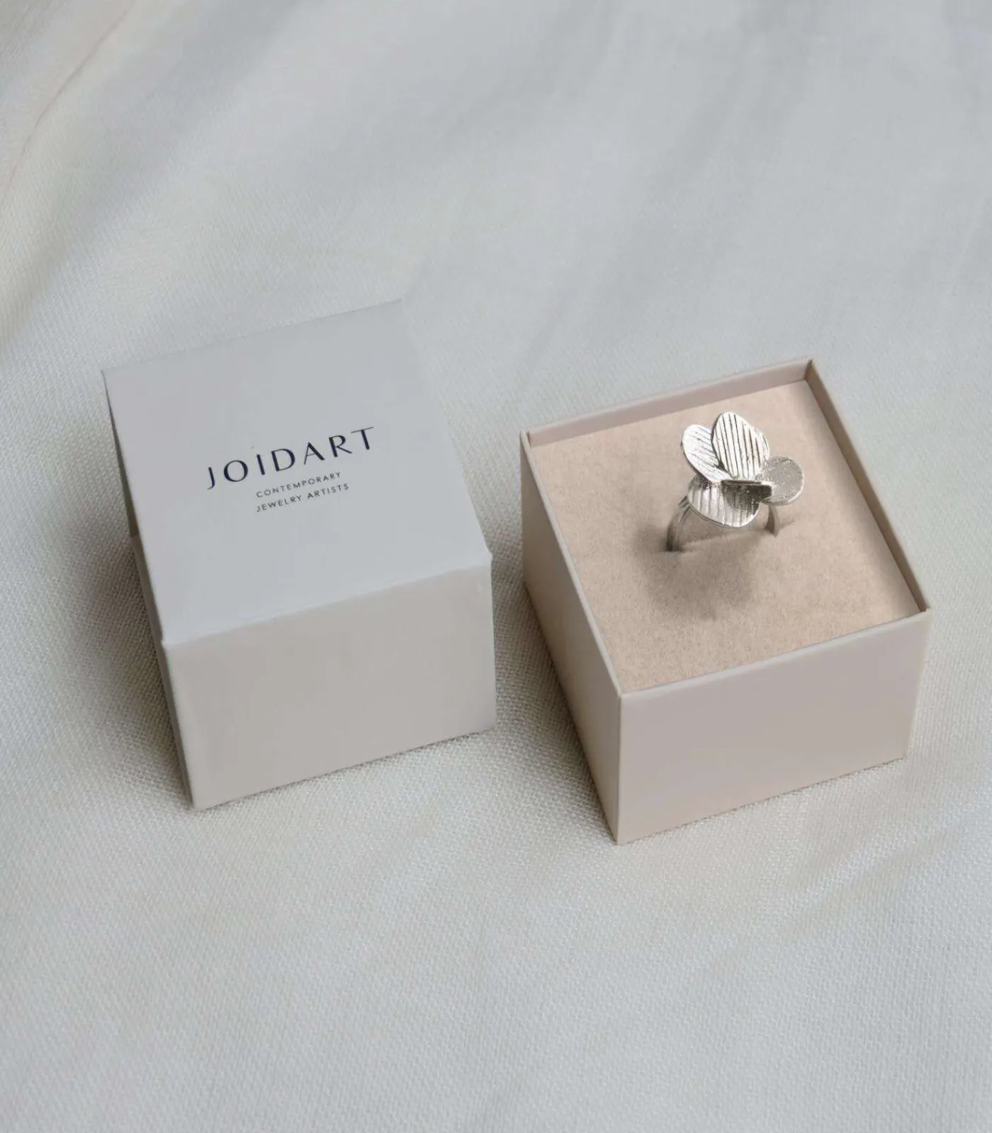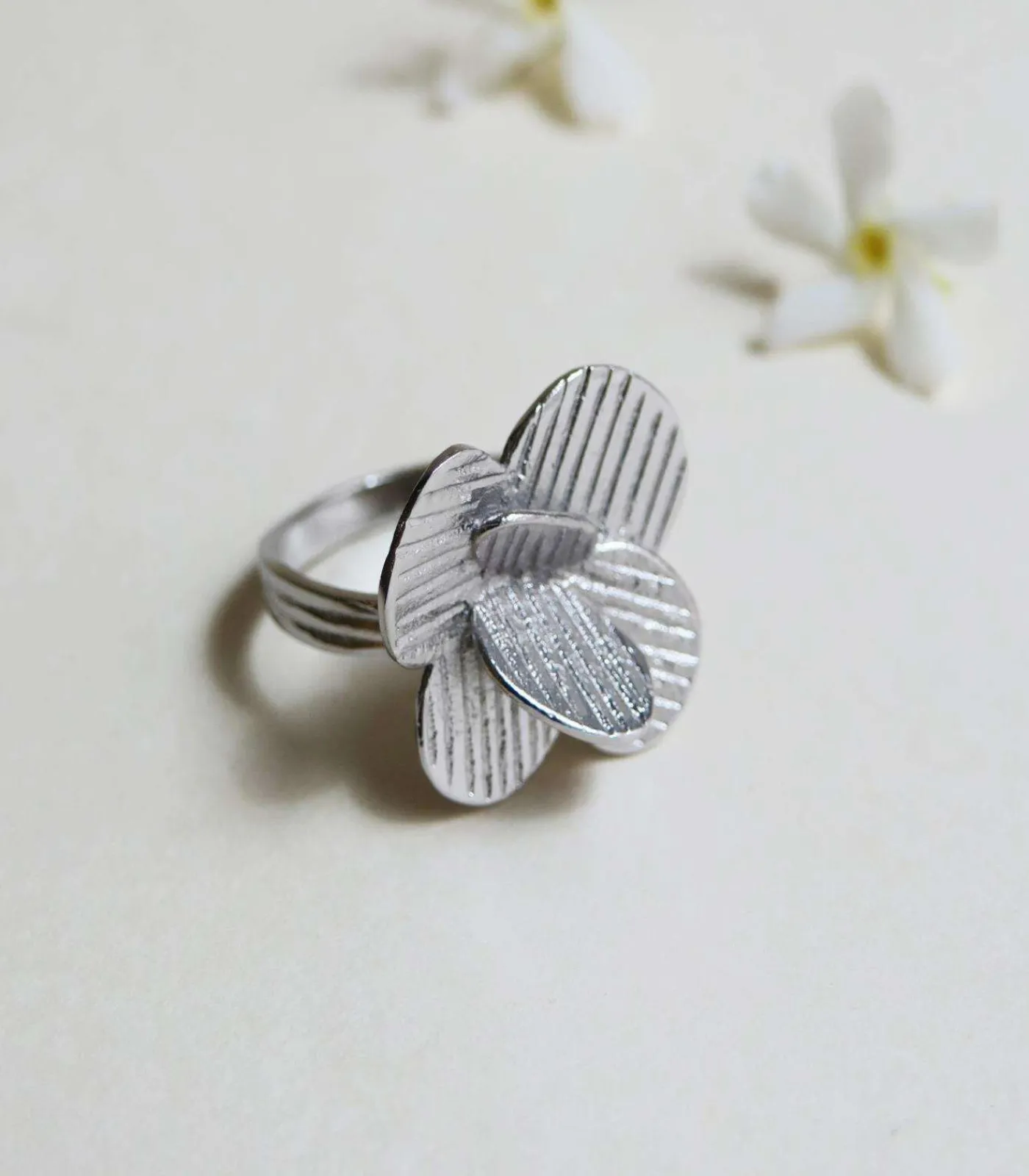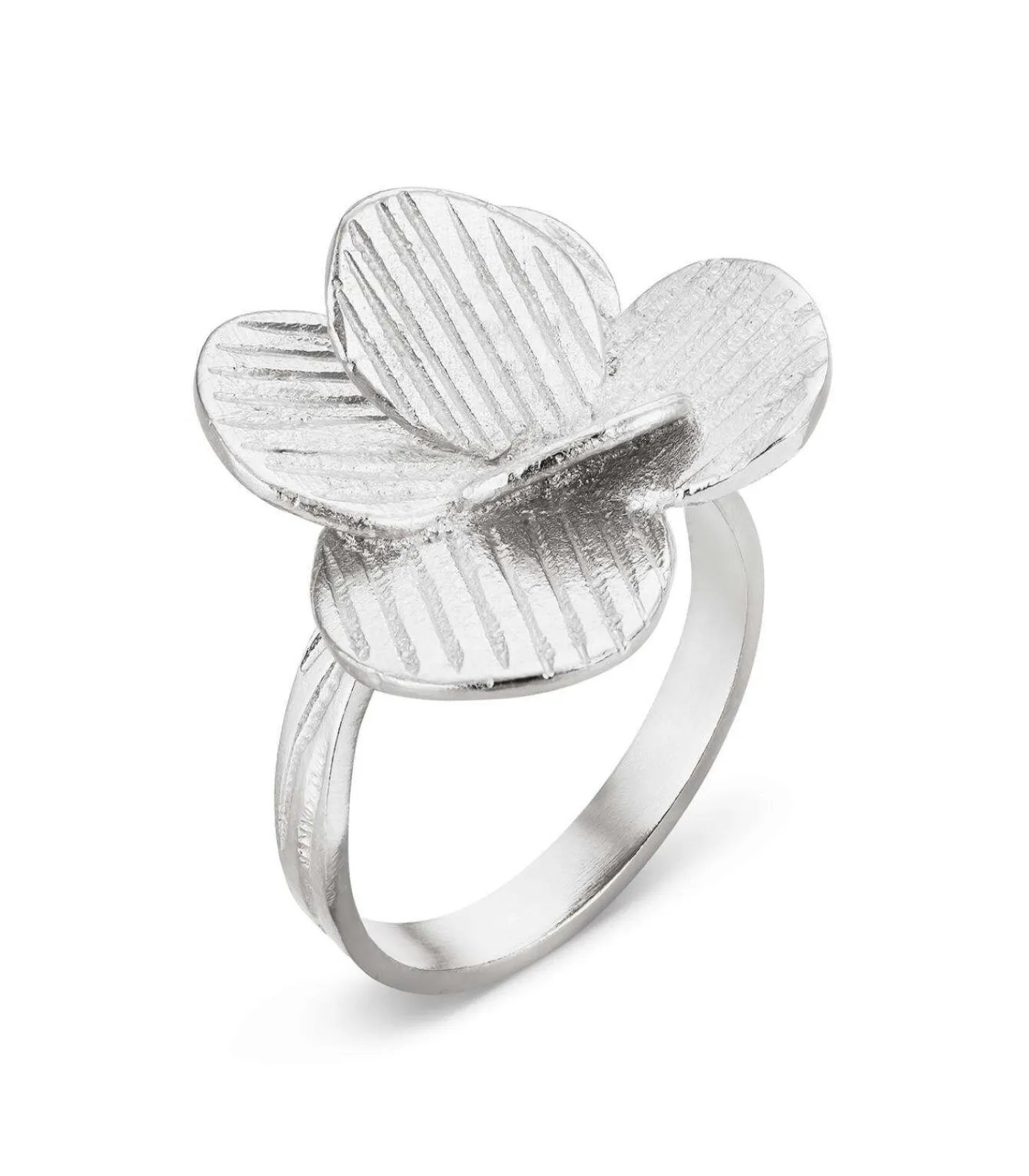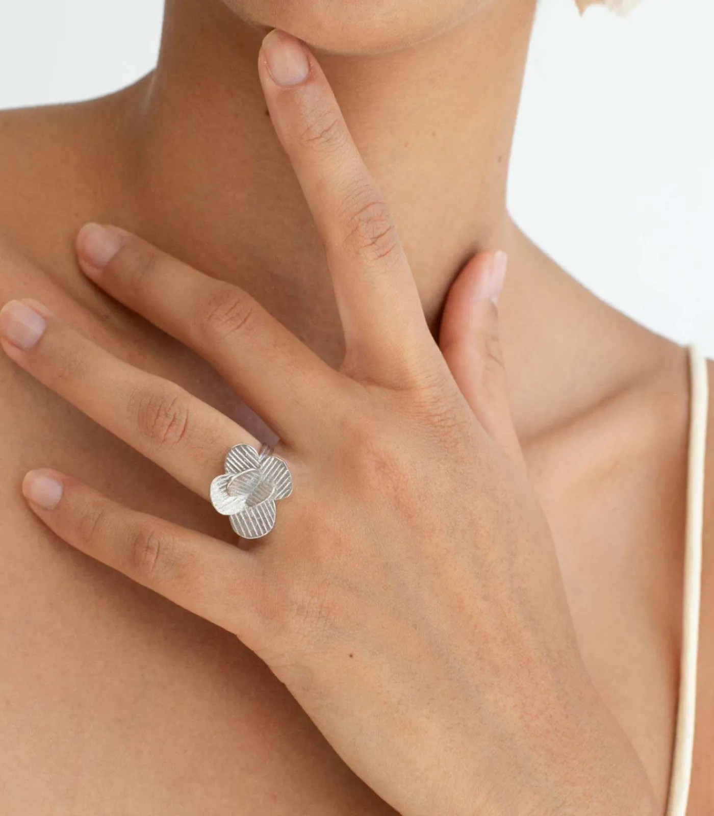 Ring van 925 zilver met een platina coating in de vorm van een wilde pioenroos uit Mallorca. Textuurontwerp.