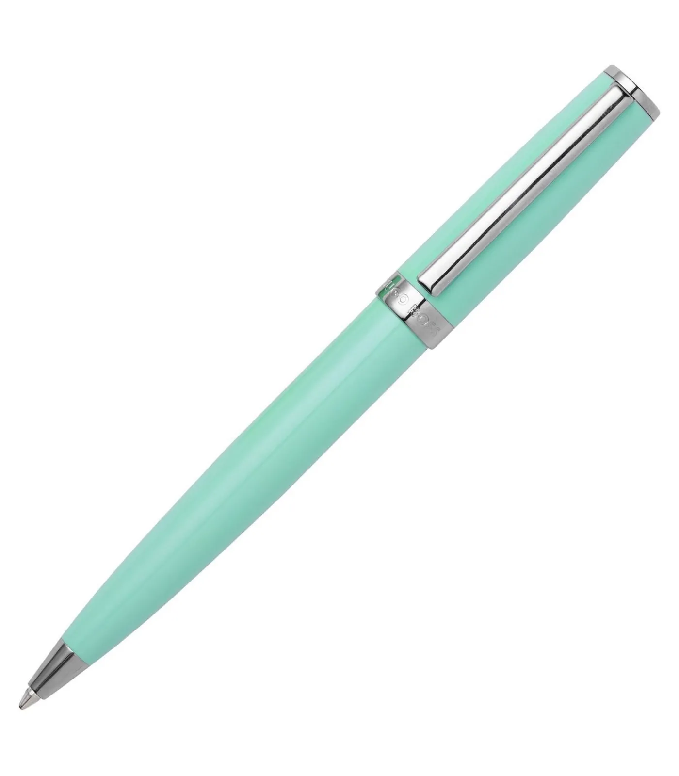 De allernieuwste versie van de iconische Gear balpen van Hugo Boss. Het bekende silhouet met een tijdloze twist, voorzien van een simplistische logo ring met glanzende lak. Het perfect gebalanceerde systeem zorgt voor een ultieme schrijfervaring. De pen wordt geleverd in een luxe design geschenkbox en is verkrijgbaar in vele verschillende kleuren, zowel neutrale, als ook in trendy zachte pasteltinten zoals deze lichtgroene versie. Dimensions: DIA.12/H.136 mm, Material: Brass,Metallic paint (shiny),Chrome plating