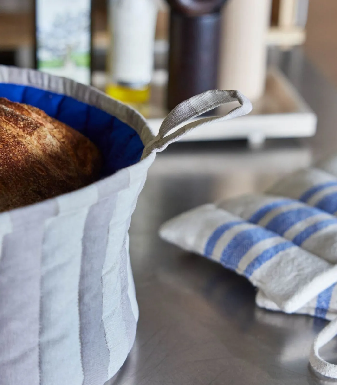 De Toppu Breadbasket, met de bekende OYOY Toppu strepen, heeft een optisch blauwe kleur aan de binnenkant, waardoor hij omkeerbaar is. Deze veelzijdige broodmand combineert stijl en functionaliteit en voegt een vleugje elegantie toe aan je tafelsetting. Perfect voor het serveren van brood of als decoratie