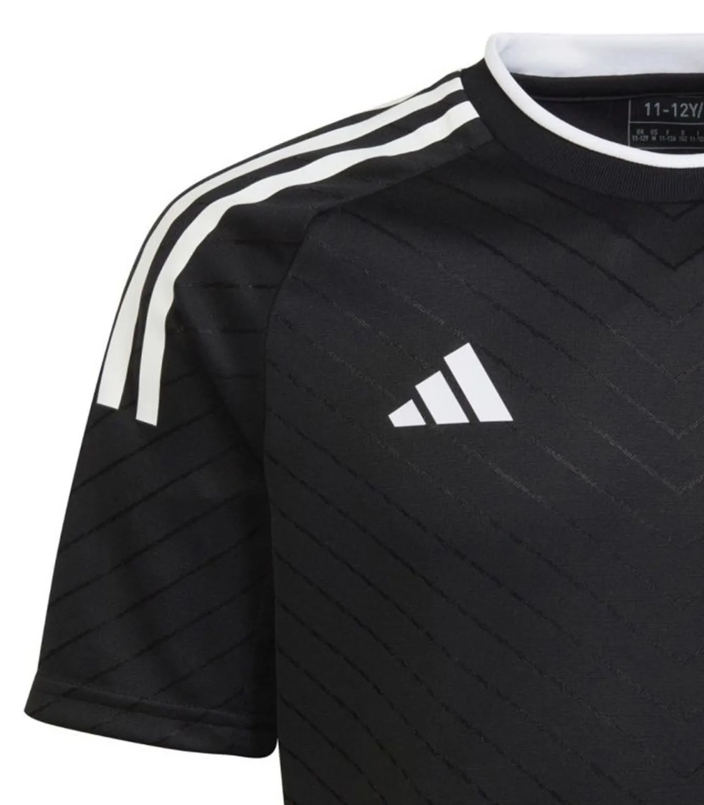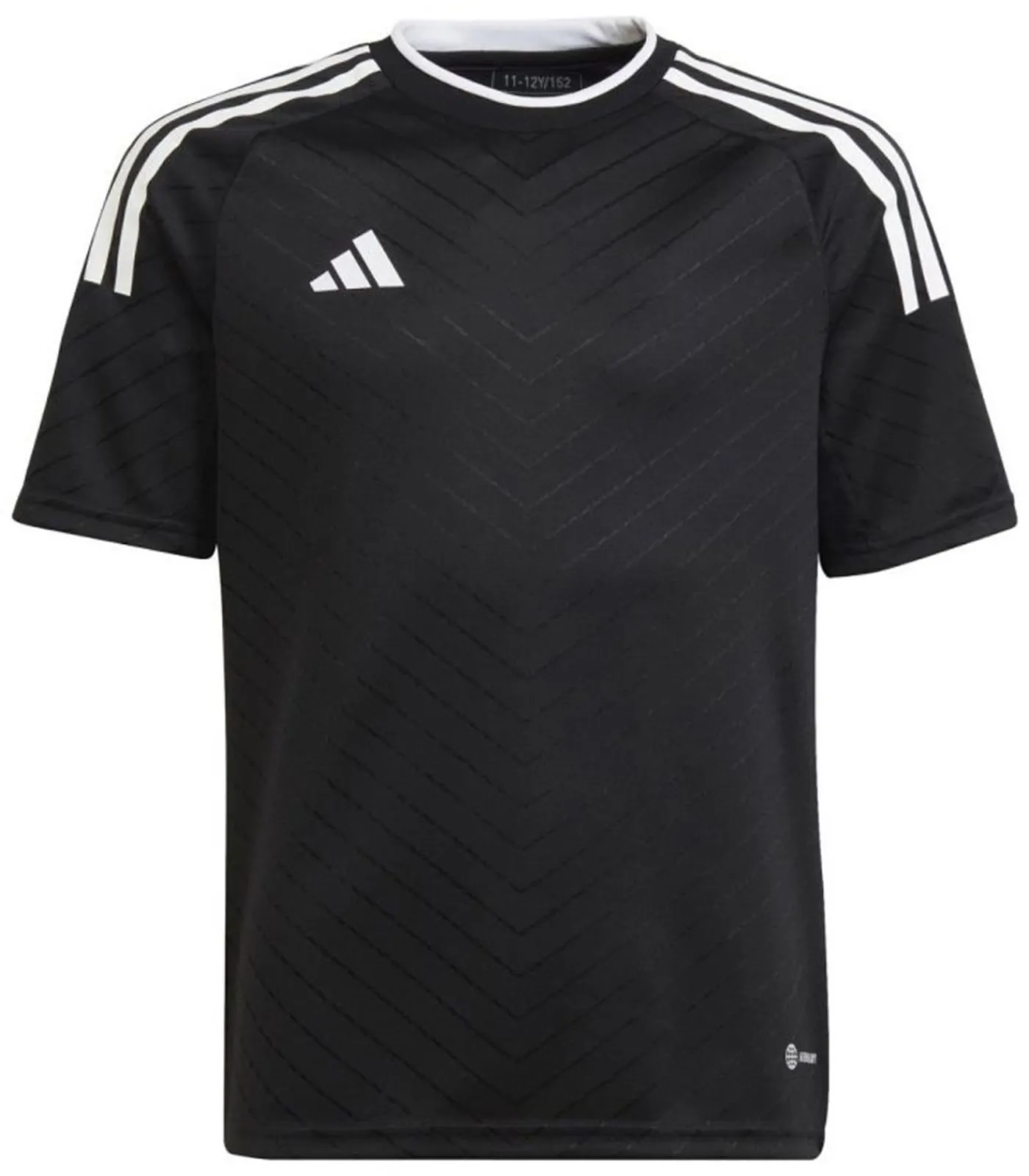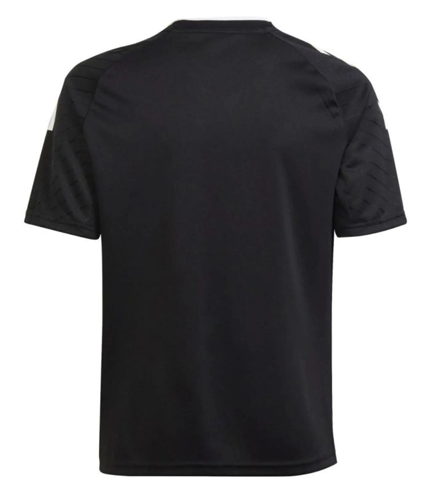 Adidas Campeón 23 – Zwarte Jersey gemaakt van 100% hergebruikbaar polyester. Dit sportkledingstuk kenmerkt zich door een contraststreep, logo en patroon met glanzend effect. De hals is van het crew neck type en de mouwen zijn kort. Voor comfortabelheid is er Aeroready stoftechnologie toegepast. Het kan regelmatig worden gedragen en pas bij een lengte van 6 jaar op maat 24 inch en bij een lengte van 10 jaar op maat 28 inch.