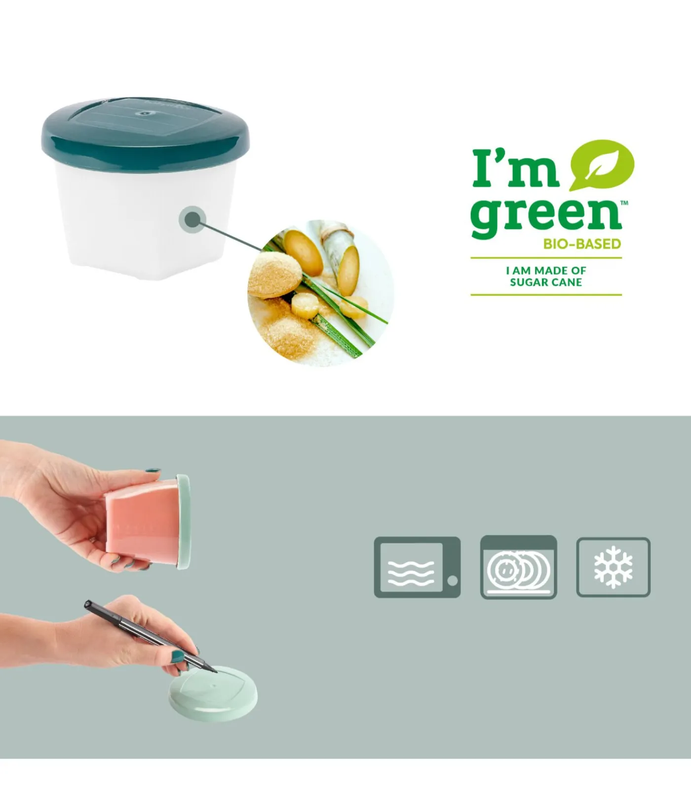 Potten gemaakt van meer dan 94% biosourced materiaal uit suikerriet om de migratie van chemische deeltjes in babyvoeding te voorkomen! Gemaakt in Frankrijk Gegradueerde potten en herschrijfbare oppervlakken om het recept en de bereidingsdatum te noteren Magnetron, bain–marie en flessenwarmer veilig Vaatwasserbestendig Hermetische schroefdeksels Bewaren in koelkast & vriezer
