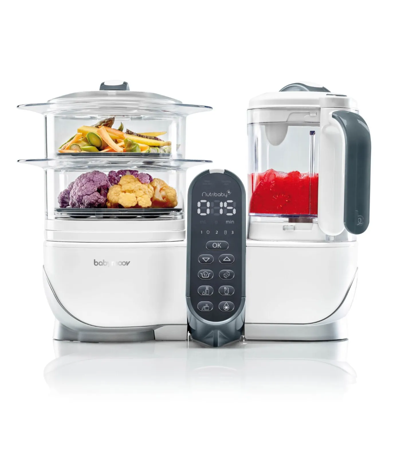 6 in 1 (voorgeprogrammeerde functies): stomen, mixen, ontdooien, steriliseren en flessenwarmer en pannenwarmer 2 manden om voedsel afzonderlijk te koken: behoudt vitamines en smaken Grote kookcapaciteit: bereid meer dan 10 maaltijden in één keer Gemakkelijk te gebruiken met zijn zes programma’s, alarmen, timer en automatische uitschakeling GRATIS: 3 babybols + 2 babylepels