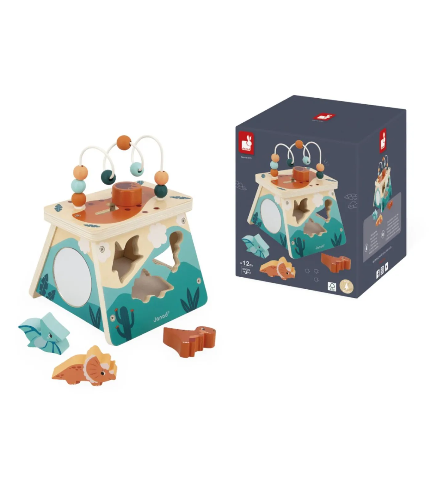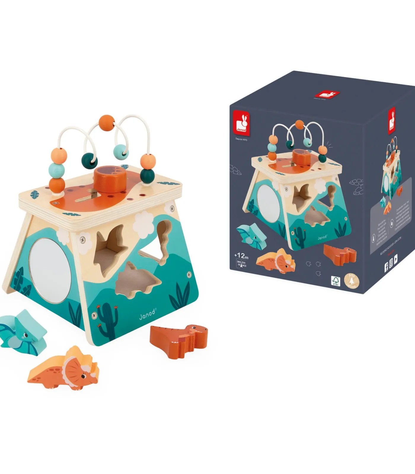 Laat uw kind in alle zachtheid kennis maken met de wereld van de dinosaurussen met deze vulkaan met meerdere activiteiten. Aan de voorkant bevindt zich een vormsorteerder met een tyrannosaurus, een triceratops en een pteranodon om in de overeenkomstige vorm te duwen. De dinosaurussen maken geen lawaai wanneer ze vallen door het vilt dat op de bodem van de vormsorteerder is aangebracht. Uw kind kan de stukken eenvoudig uit het speelgoed nemen via de grote opening aan de zijkant. De achterkant is voorzien van drie tandwielen om te draaien, de linkerkant bezit een spiegel en op de bovenkant van deze vulkaan bevindt zich een doolhof en een telraam met houten kralen. Deze 5 activiteiten helpen uw kind bij het ontwikkelen van zijn fijne motoriek, behendigheid en nieuwsgierigheid. Speelgoed van FSC™–hout. Educatief speelgoed voor kinderen vanaf 12 maanden.